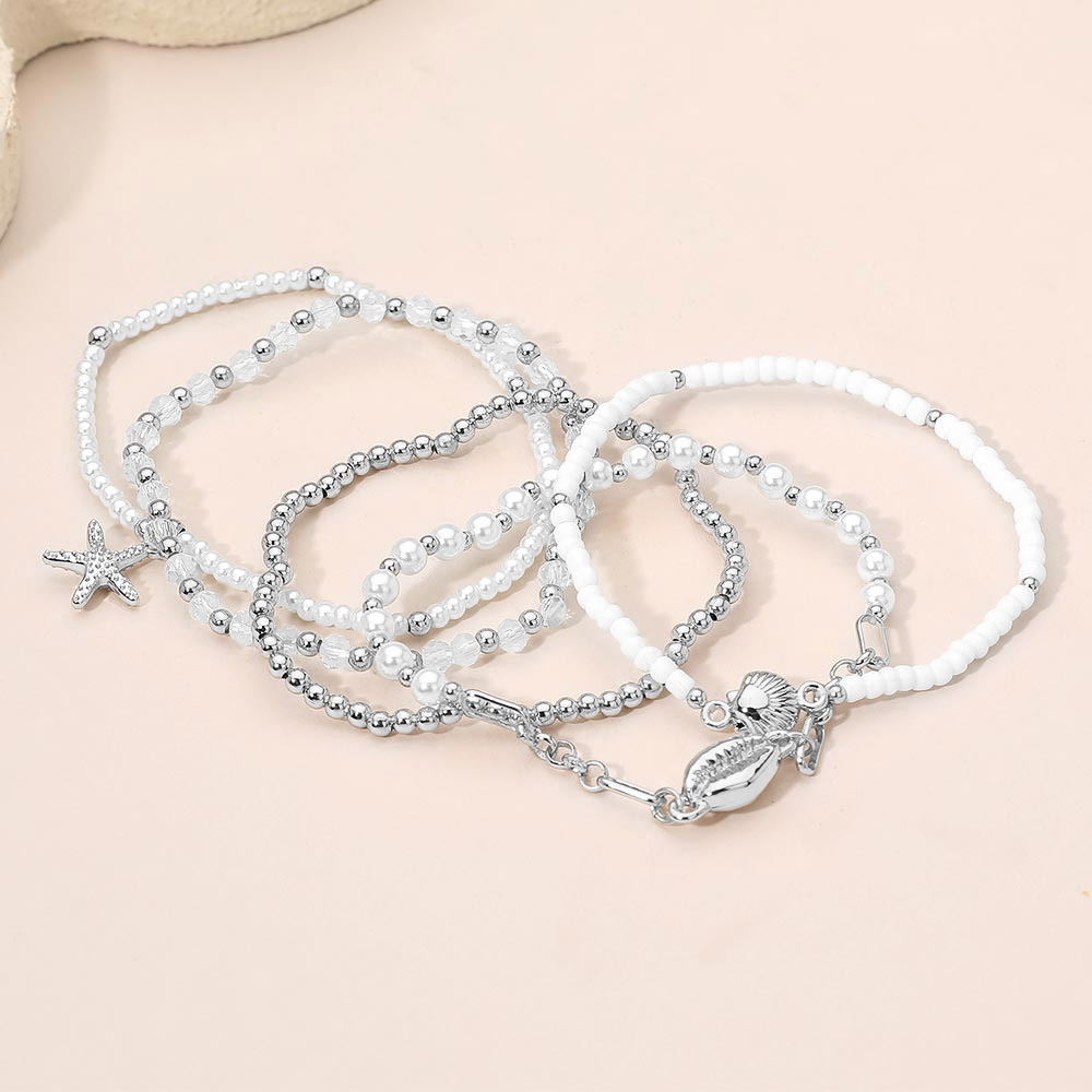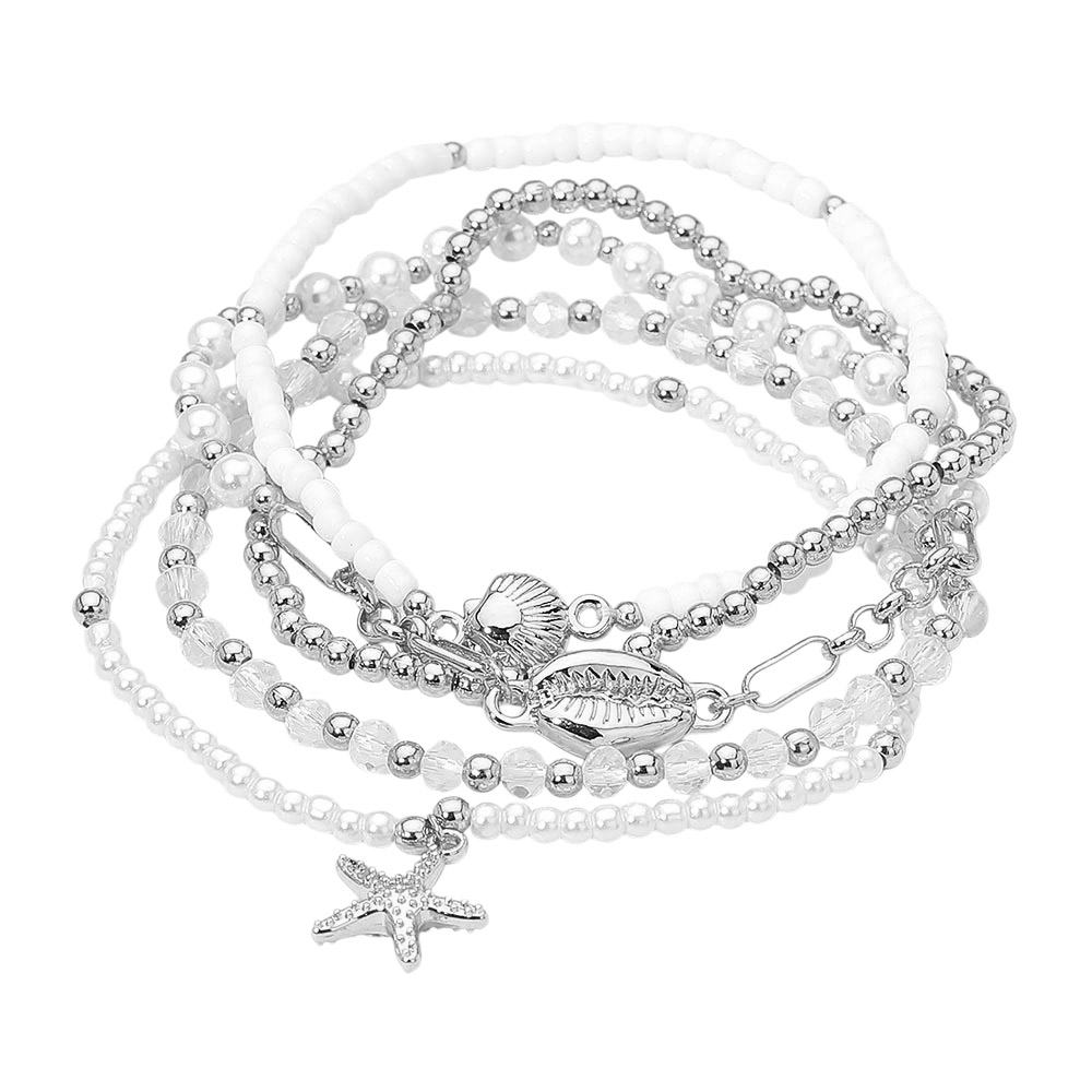• Bring seaside elegance to your style with this Ocean Charm Beaded Layered Bracelet Set. Featuring shells, pearls, and starfish accents, this five-piece stack creates a playful coastal look. Ideal for adding a breezy, beach-inspired touch to casual or summer outfits.