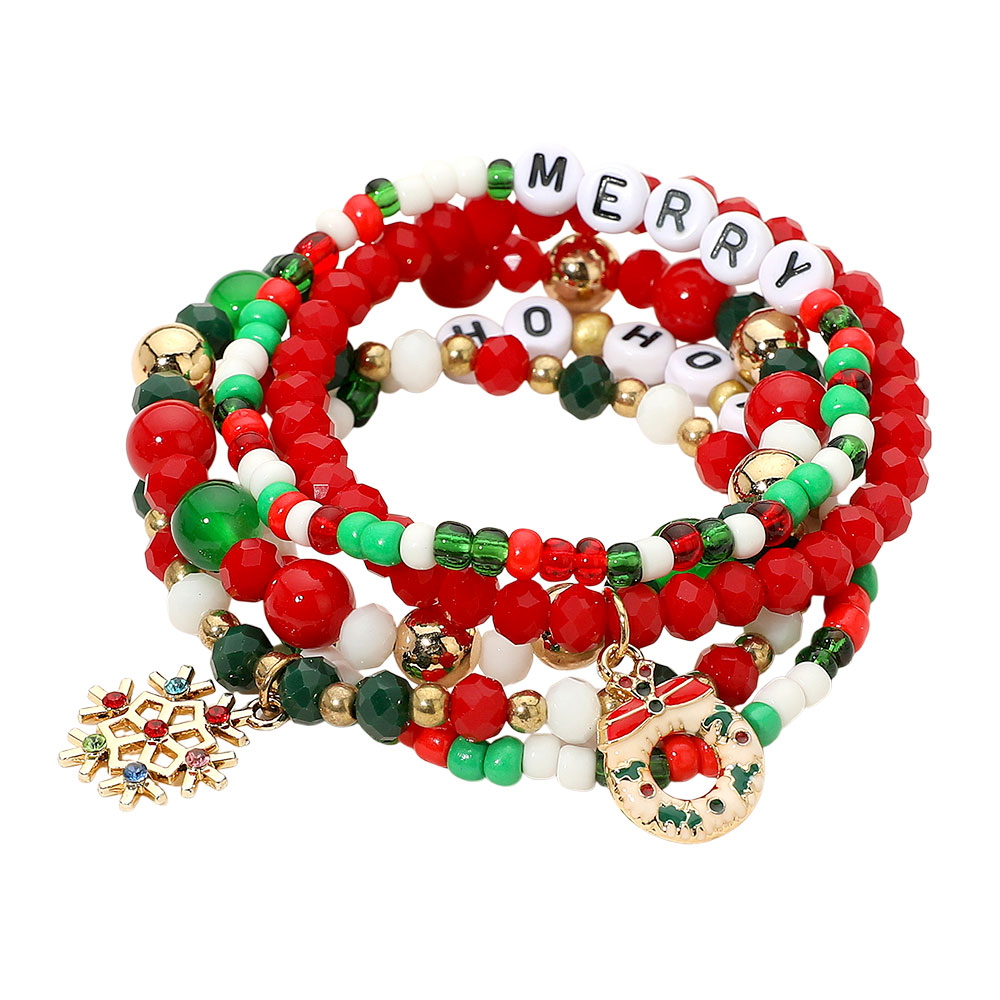 Details • Size : 1.4" H • Stretchable • Cheerful holiday beaded bracelet set featuring colorful stackable strands with playful letter beads and festive charms. Perfect for Christmas parties, seasonal celebrations, or gifting, this fun set adds sparkle and holiday spirit to any outfit while bringing joyful charm to your jewelry collection. • Lead and Nickel Compliant