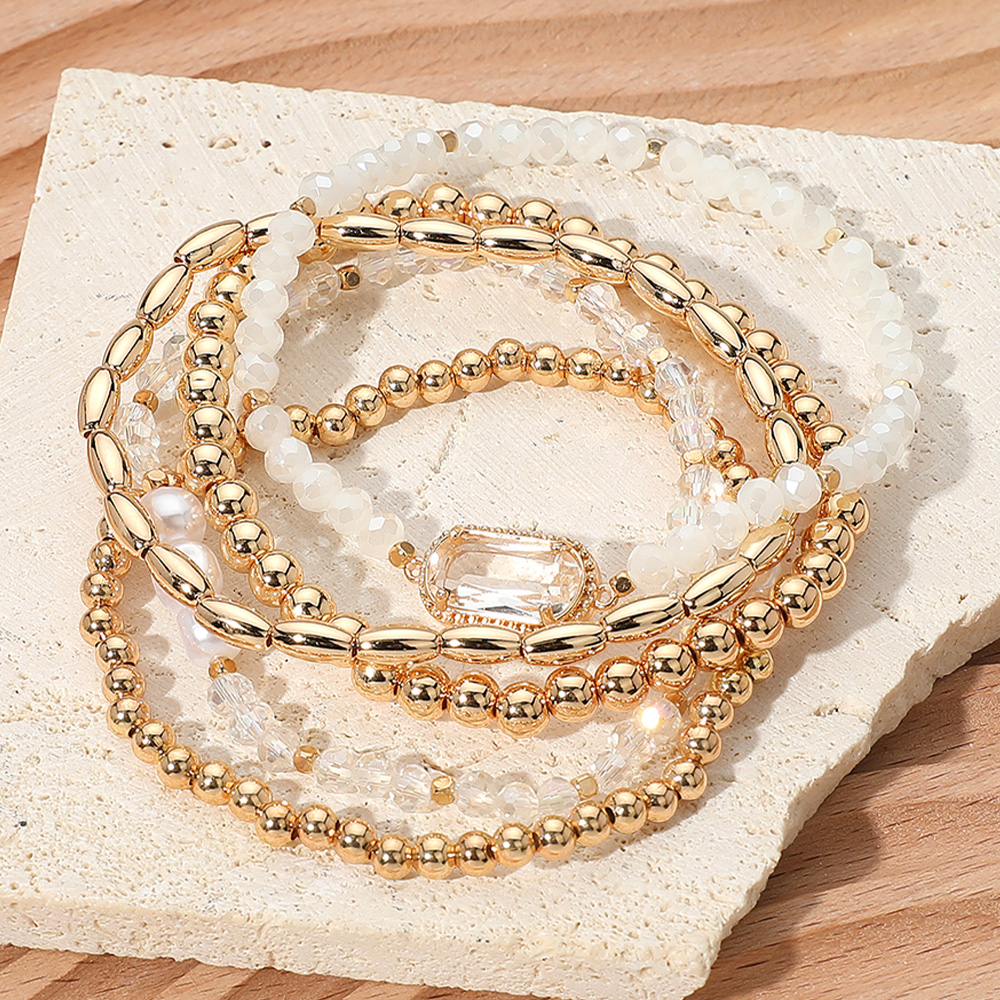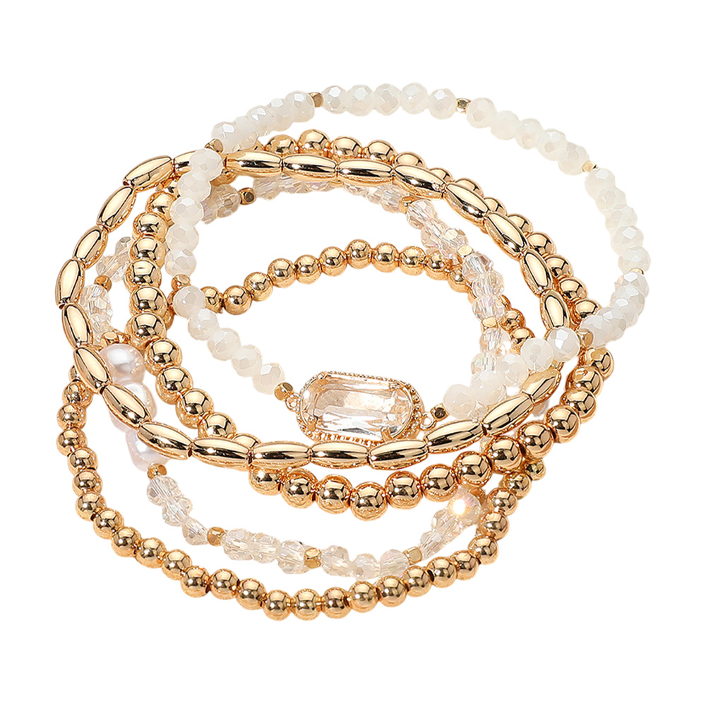 5PCS - Stone Charm Pointed Metal Ball Pearl Faceted Beaded Stretch Multi Layered Bracelets