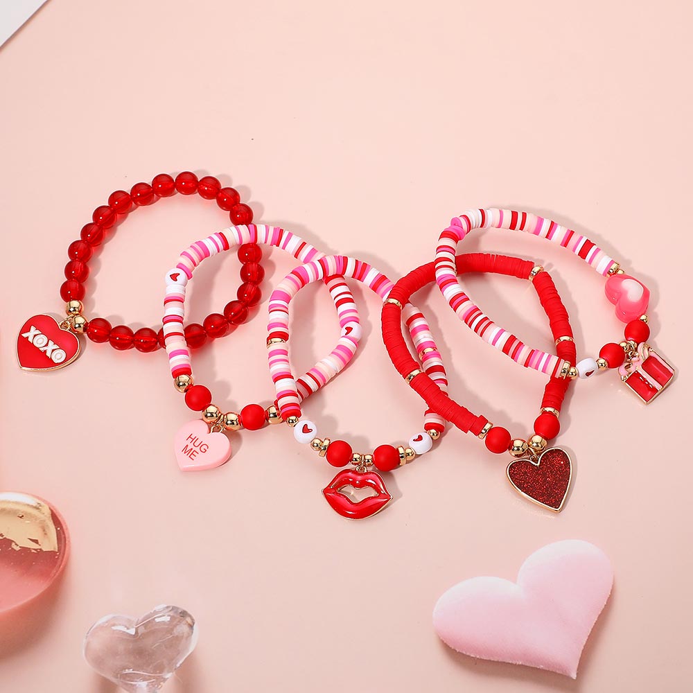 Details • Size : 1.4" H • Stretchable • Playful Valentine-themed stretch bracelet set featuring heart charms, love motifs, and mixed bead styles. A fun, expressive accessory that adds a sweet romantic touch to everyday wear or gifting. • Lead and Nickel Compliant