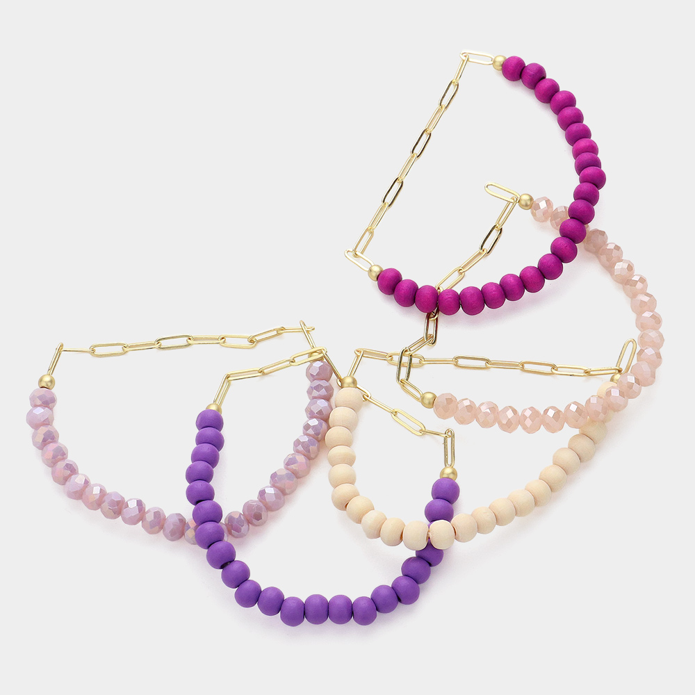 5PCS - Wood Faceted Beaded Paperclip Chain Stretch Multi Layered Bracelet