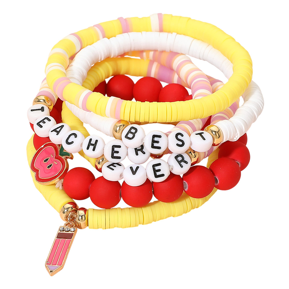 Details • Size : 1.75" H • Stretchable • Playful stretch bracelet set featuring letter beads spelling a cheerful message with fun charm accents. Designed for comfortable slip-on wear, this stacked bracelet set adds personality to everyday outfits and makes a thoughtful gift for teachers, students, or anyone who loves expressive, feel-good accessories.