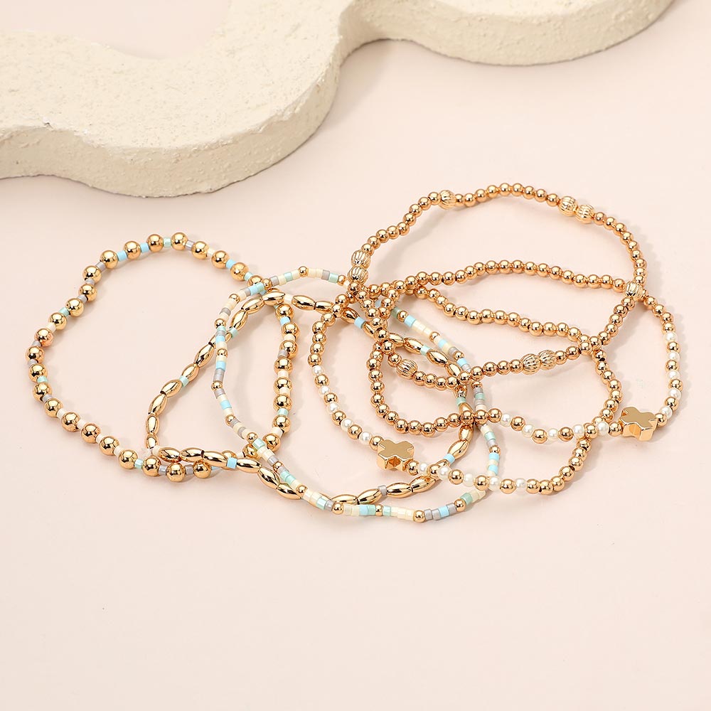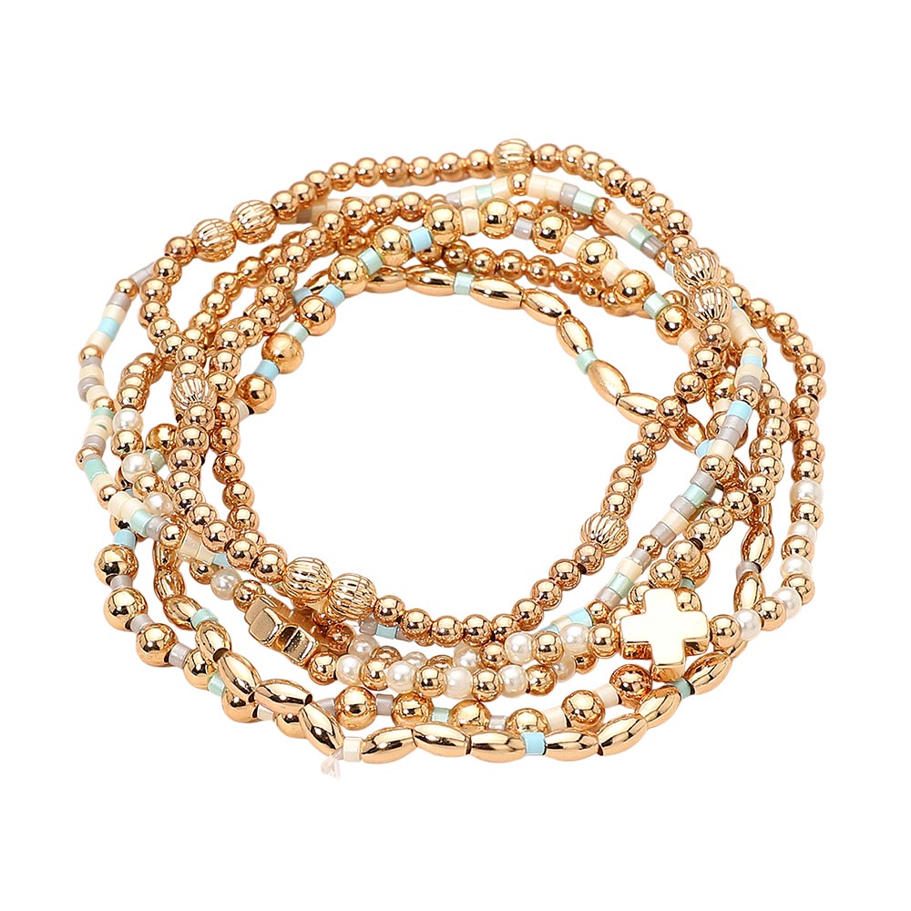 6PCS - Cross Charm Accent Seed Beaded Stretch Multi Layered Bracelets