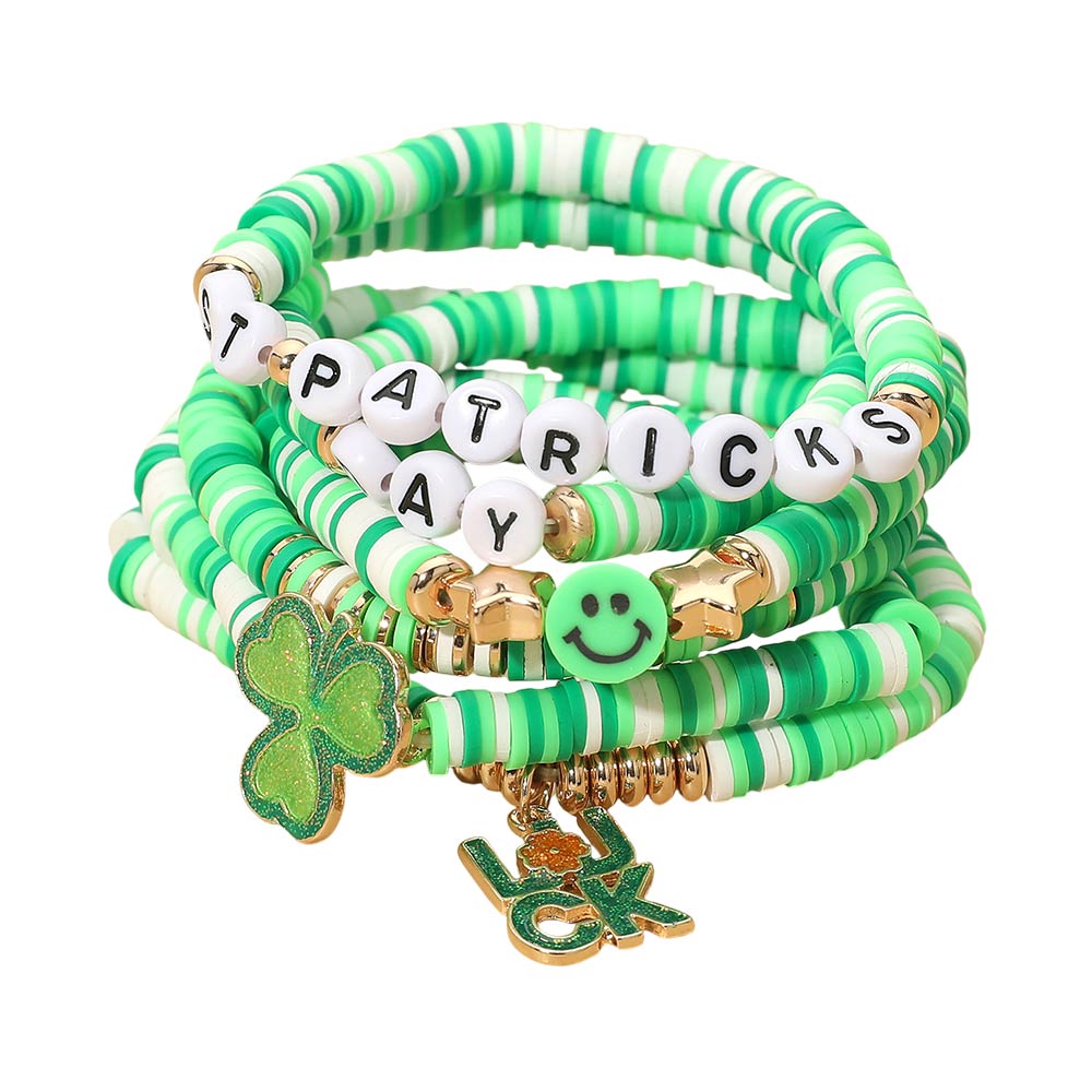 Details • Size : 2.25" H • Stretchable • Festive stretch bracelet set designed for St. Patrick’s Day featuring lucky-themed charms, playful letter beads, and stackable styling. Easy to wear and perfect for gifting, party favors, seasonal displays, parades, and boutique assortments that celebrate Irish-inspired fun and cheerful holiday accessorizing. • Lead and Nickel Compliant