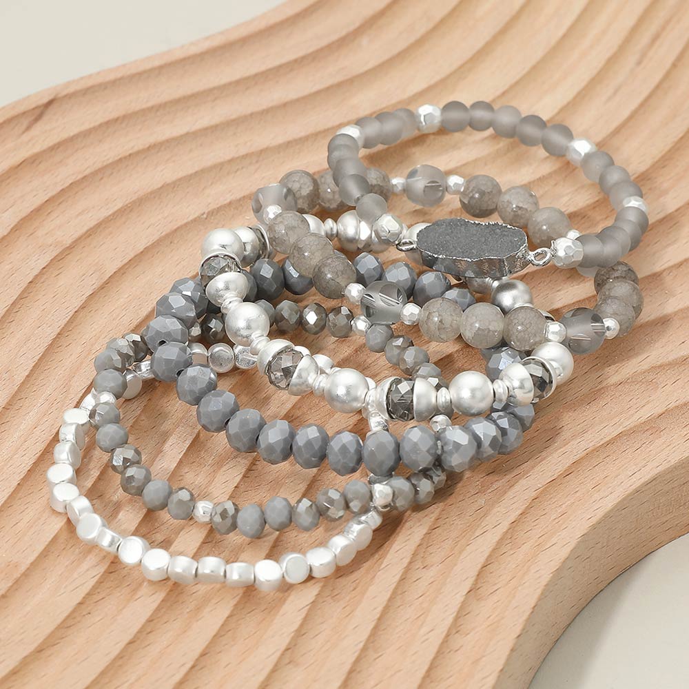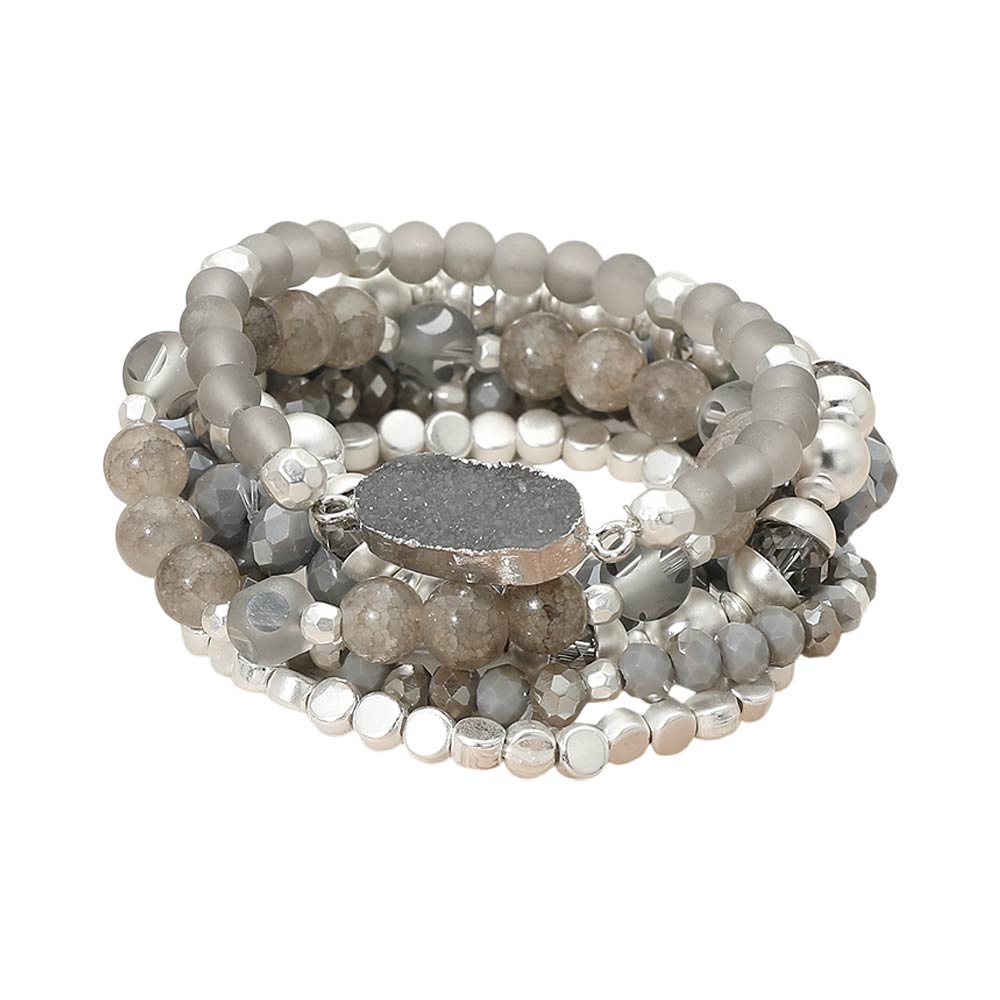 6PCS - Oval Druzy Charm Accent Faceted Beaded Stretch Multi Layered Bracelets