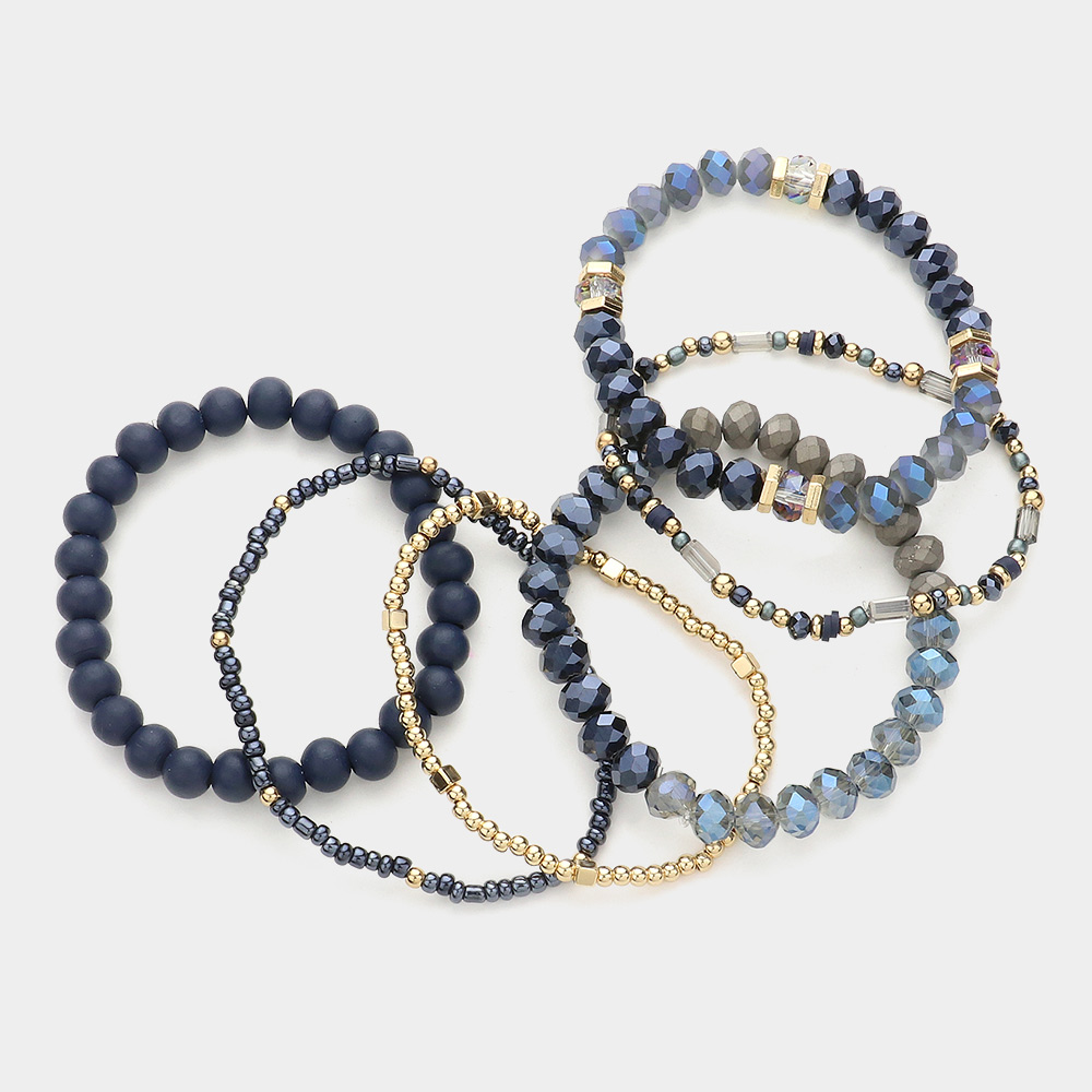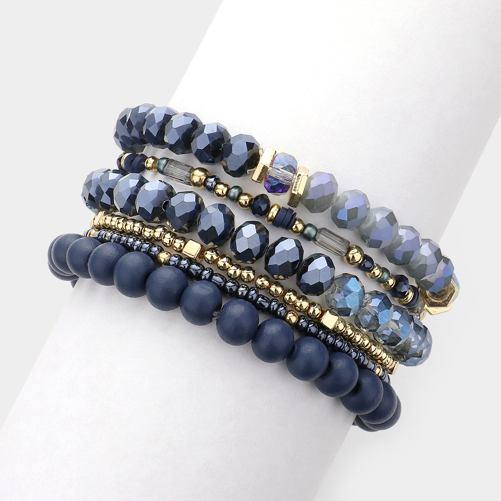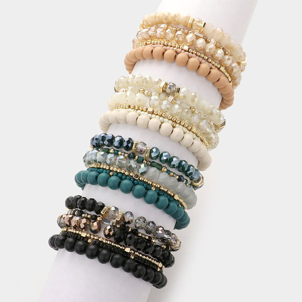 6PCS - Wood Ball Faceted Beaded Stretch Multi Layered Bracelets