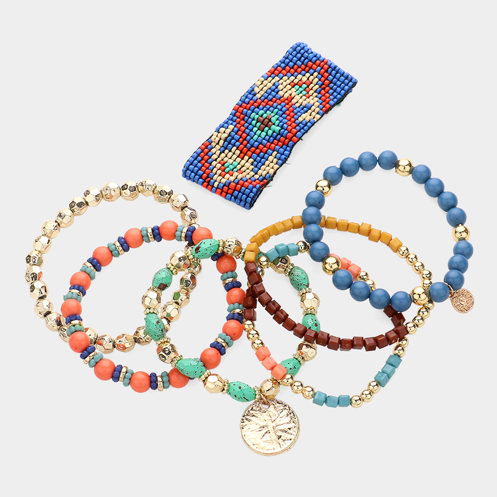 6PCS - Tassel Pointed Faceted Beaded Pearl Stretch Evil Eye Pointed Beaded Cinch Pull Tie Multi Layered Bracelets