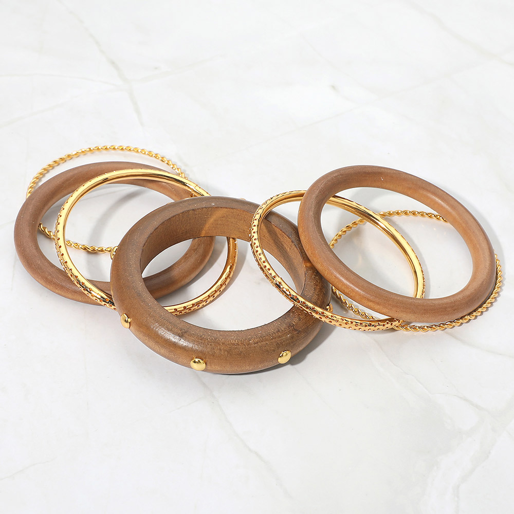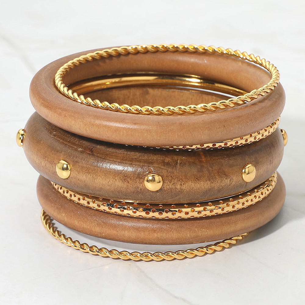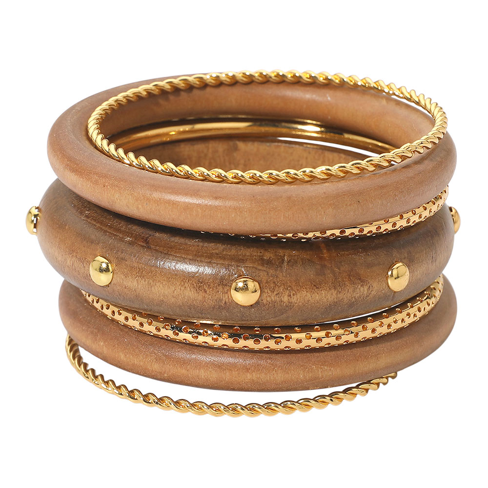 7PCS - Bold Stud Accent Wooden Metal Bangle Multi Layered Bracelets
