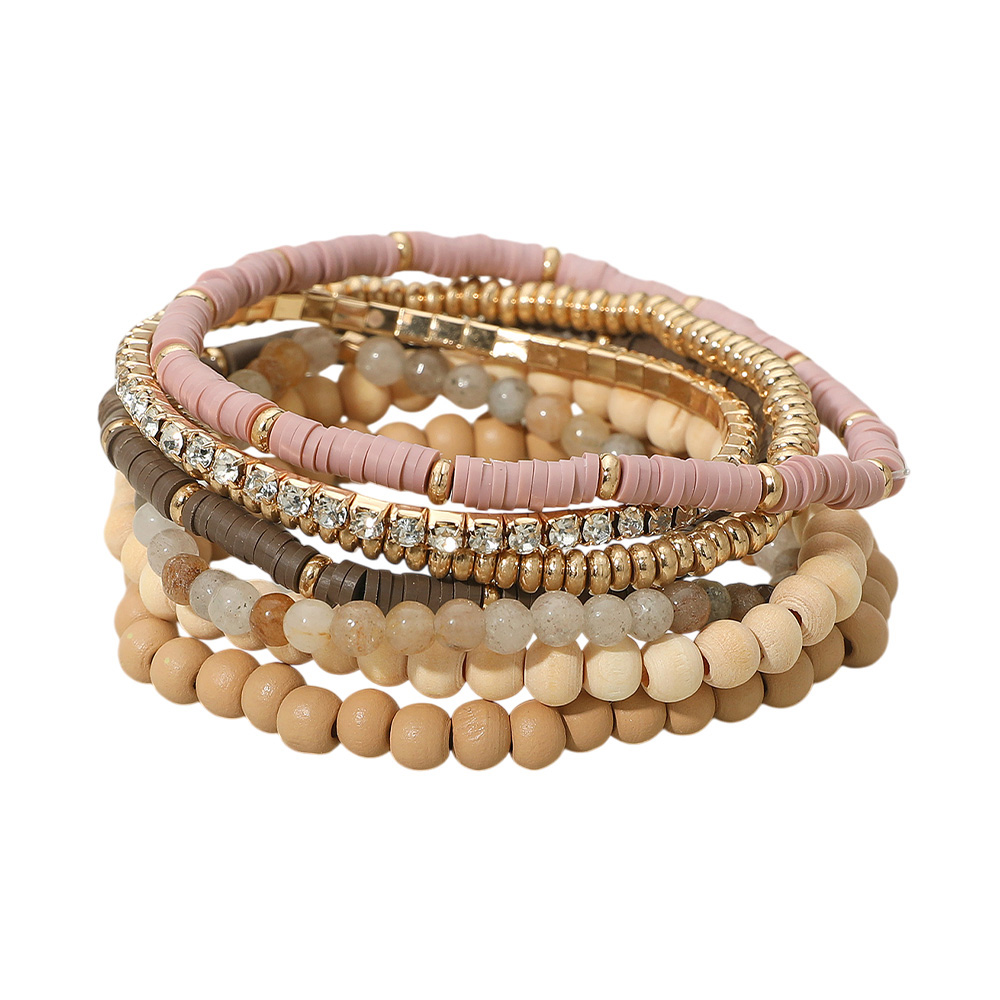 Details • Size : 1.3" H • Stretchable • This multi-strand stretch bracelet set combines a mix of smooth beads, metallic accents, and shimmering details for a stylish layered look. Easy to slip on, it offers comfort and versatility, making it perfect for stacking or wearing alone as a bold statement accessory. • Lead and Nickel Compliant