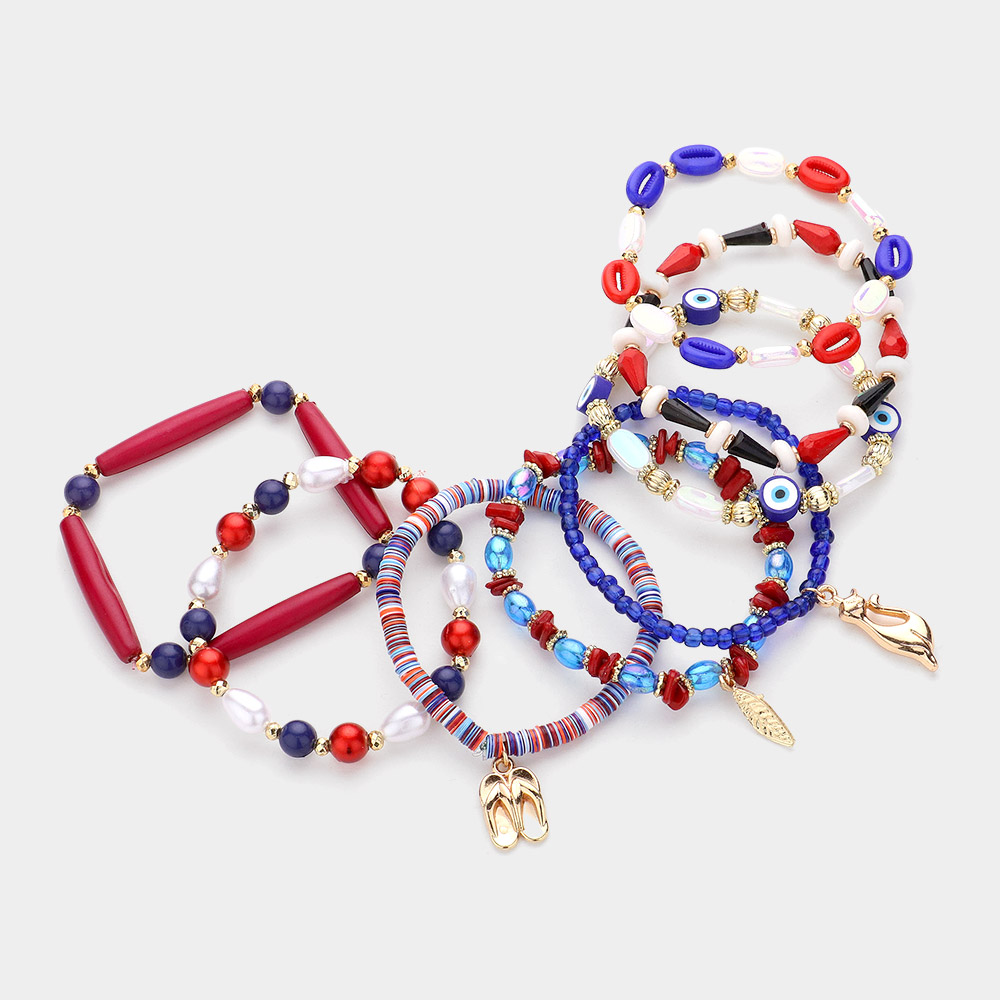 8PCS - Metal Flip Flops Leaf Cat Charm Evil Eye Pointed Various Beads Beaded Stretch Multi Layered Bracelet