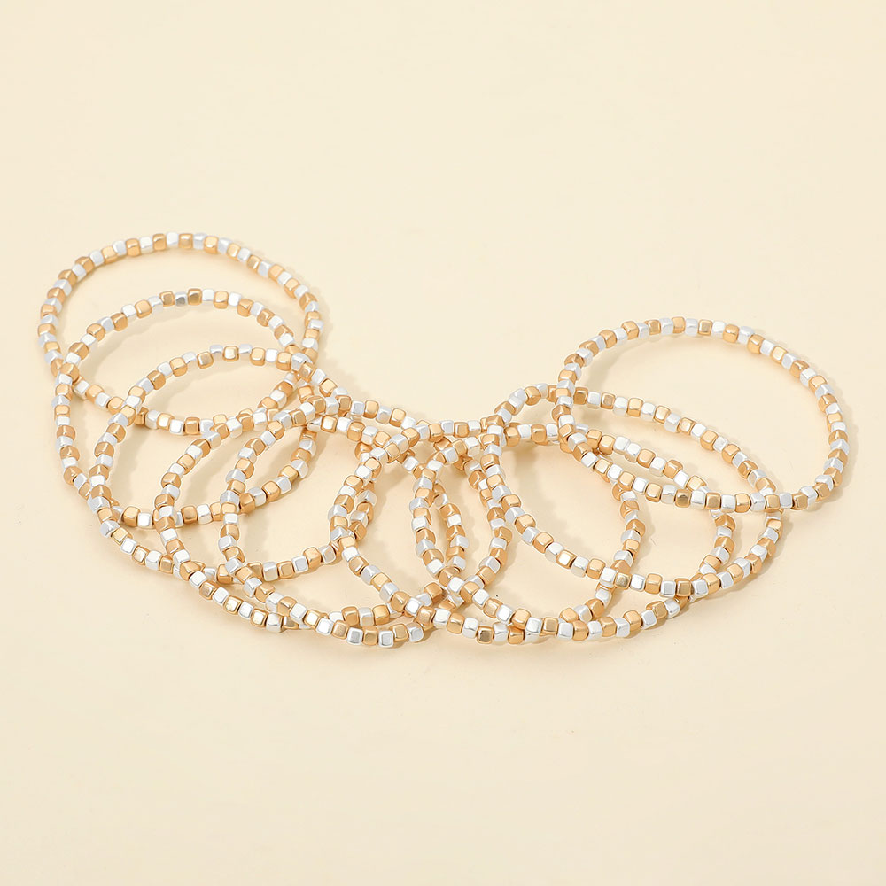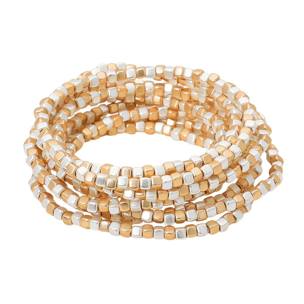 • Add shimmer to your style with this multi-strand beaded stretch bracelet set featuring sleek metallic cube beads. Lightweight and easy to wear, it wraps comfortably around the wrist for a bold layered look. Perfect for stacking or wearing solo in any casual or dressy outfit.