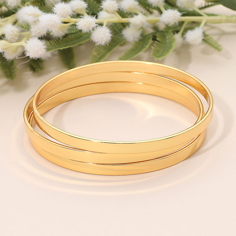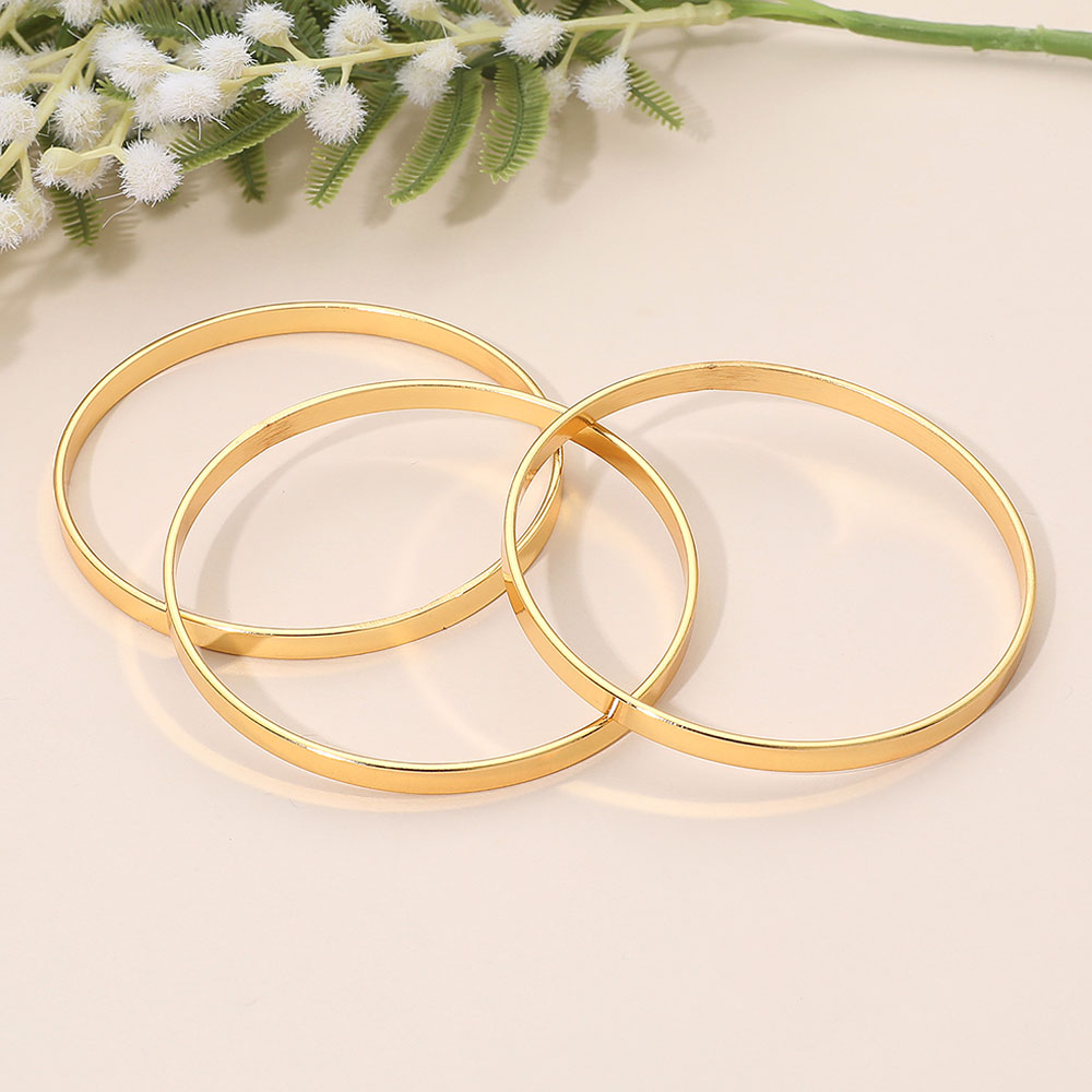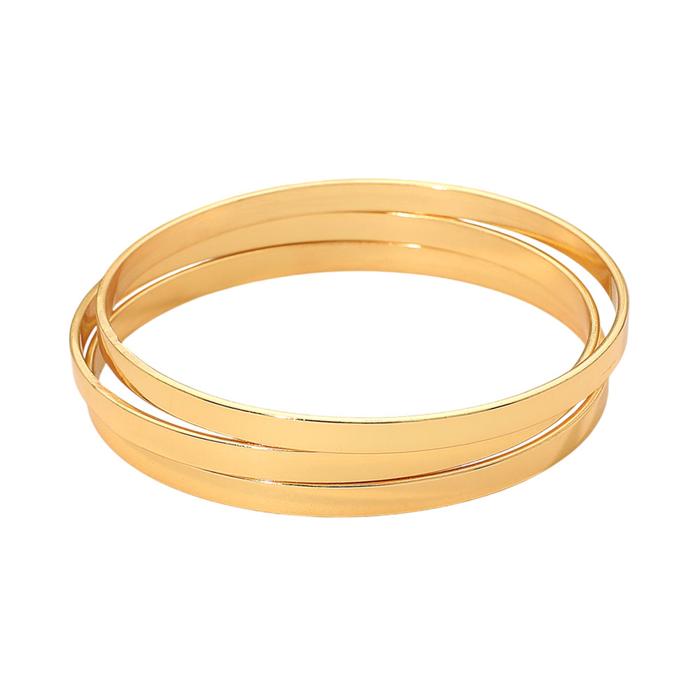 Details • Size : 0.7" H, 2.75" D • Water Resistant • Sleek stacked bangle bracelet set featuring smooth, wide bands for a bold yet minimalist statement. Designed to elevate everyday outfits or complement refined evening looks, this versatile trio offers polished shine and effortless style worn together or mixed with other favorite accessories. • Hypoallergenic • Stainless Steel