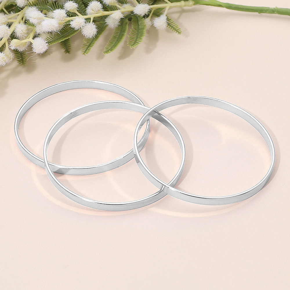 Details • Size : 0.7" H, 2.75" D • Water Resistant • Sleek stacked bangle bracelet set featuring smooth, wide bands for a bold yet minimalist statement. Designed to elevate everyday outfits or complement refined evening looks, this versatile trio offers polished shine and effortless style worn together or mixed with other favorite accessories. • Hypoallergenic • Stainless Steel