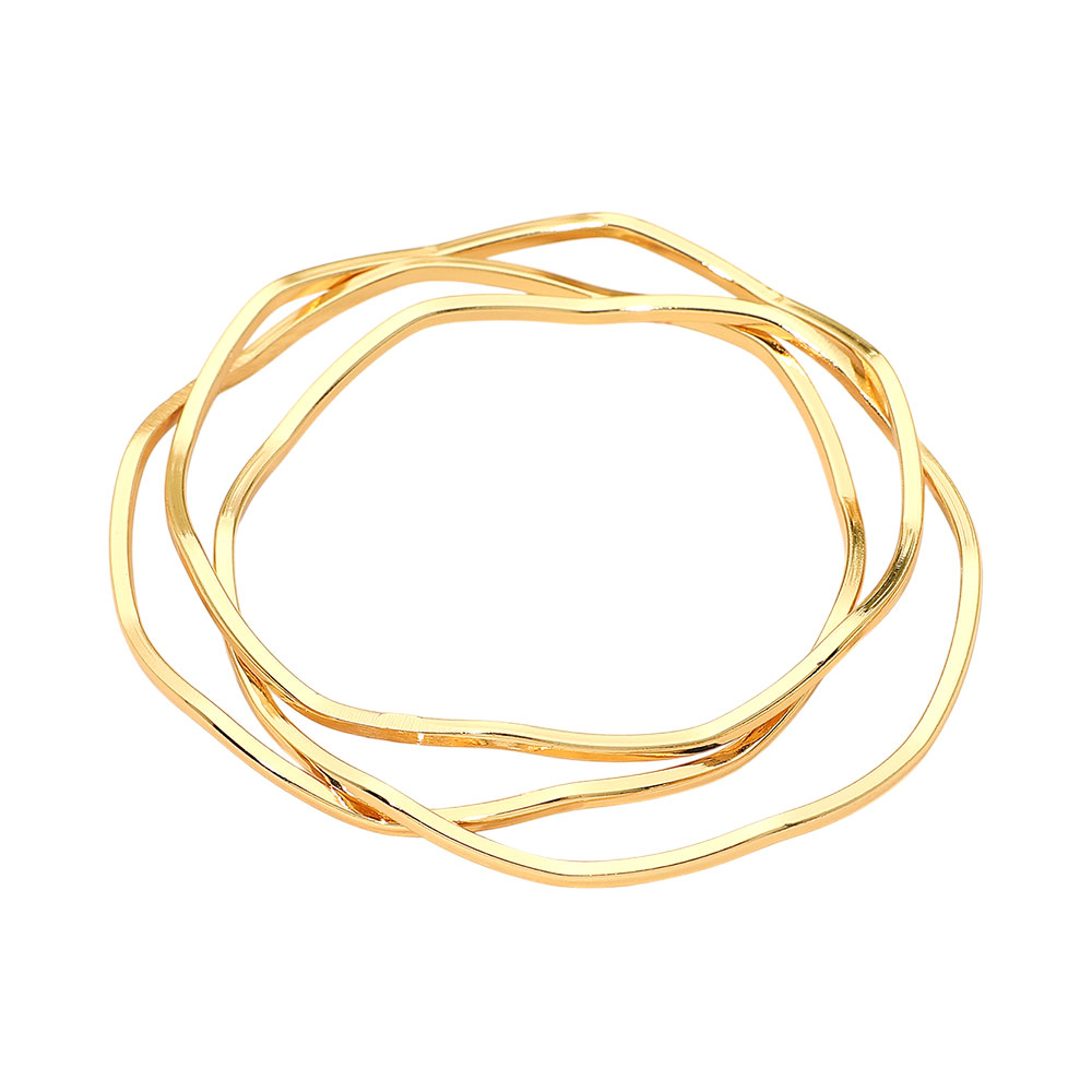 Details • Size : 0.25" H, 24" D • Water Resistant • Elegant layered bangle bracelet set featuring softly textured, organic-shaped bands for subtle dimension and shine. Designed to elevate everyday looks or complete polished outfits, this versatile stack can be worn together for a statement or mixed effortlessly with other favorites. • Hypoallergenic • Stainless Steel