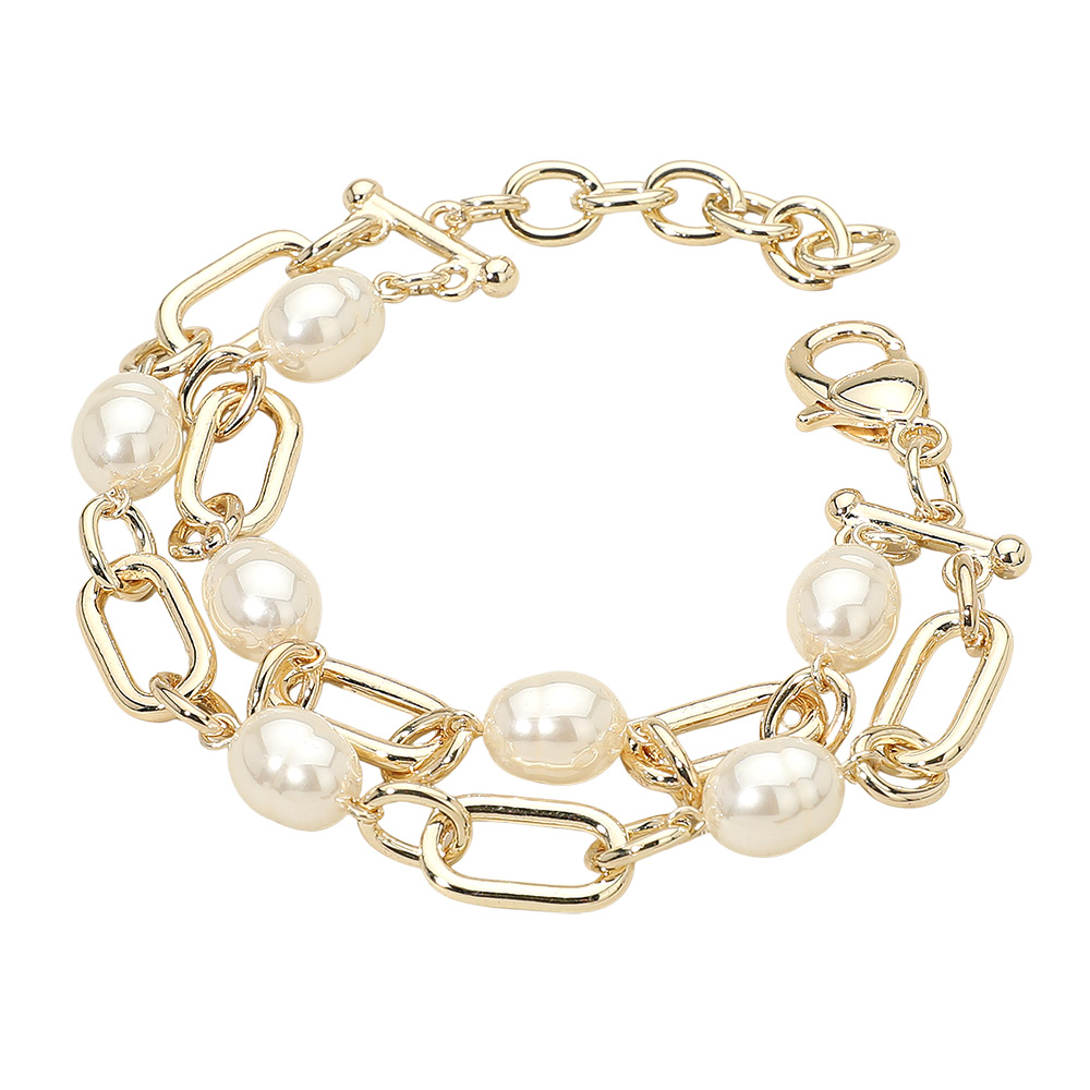 14K Gold Plated Double Strand Pearl Link Accent Bracelet