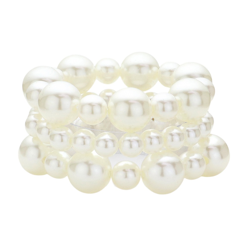 Details • Size : 1.75" H • Stretchable • Elegant triple row stretch bracelet featuring round pearl-like beads in alternating sizes. A timeless piece that adds sophistication to casual wear, weddings, parties, and formal occasions. • Lead and Nickel Compliant