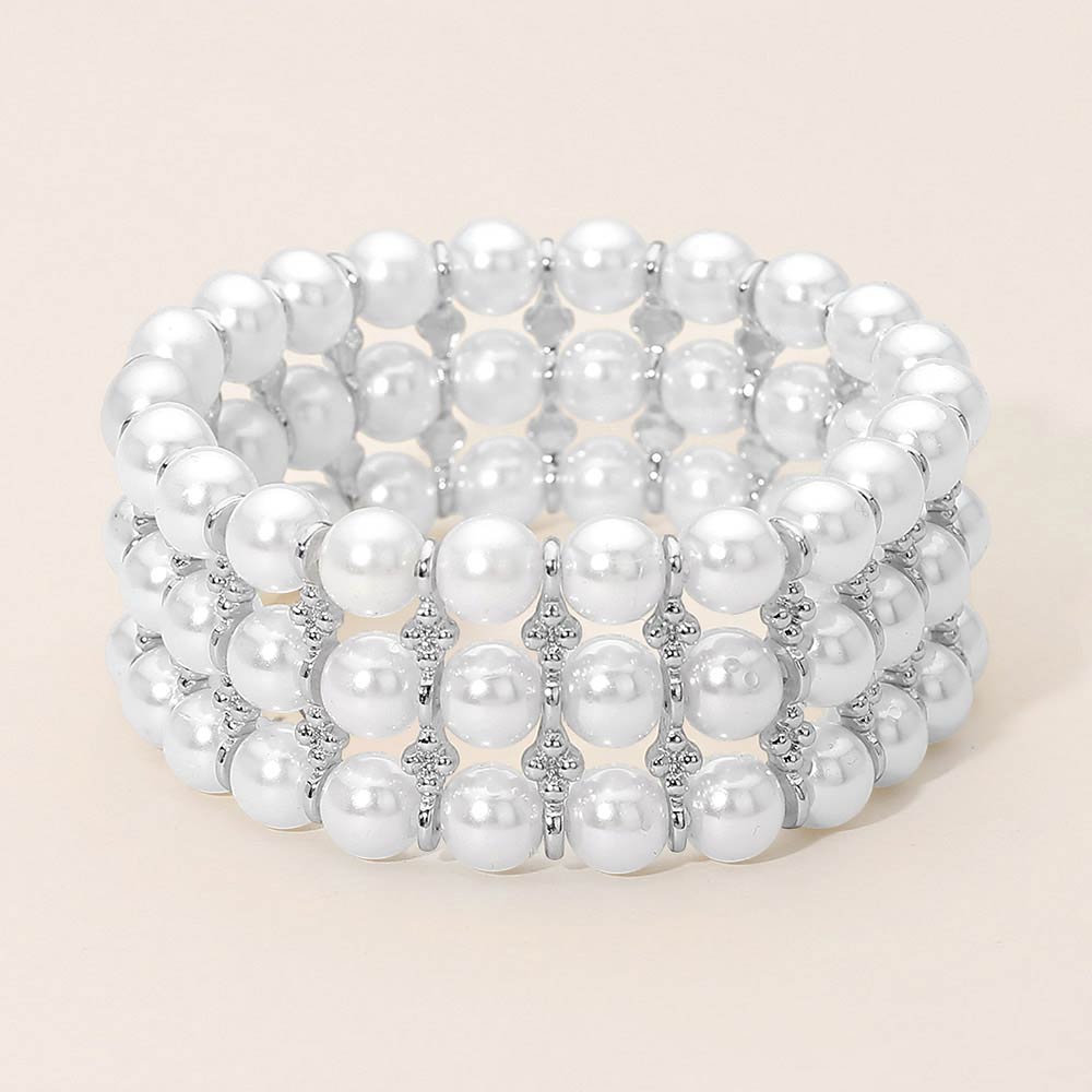 Details • Size : 1" H • Stretchable • Elegant stretch bracelet designed with layered round pearl-style beads and refined spacer accents for a timeless, polished look. The flexible slip-on fit offers comfort and easy wear, making it perfect for everyday styling, special occasions, or stacking with other bracelets. A versatile accessory that adds effortless sophistication to any outfit. • Lead and Nickel Compliant