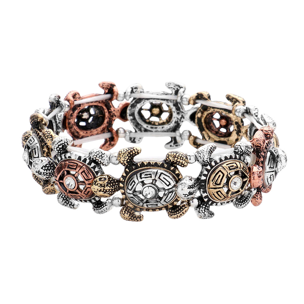 Antique Metal Stone Centered Turtle Link Stretch Bracelet