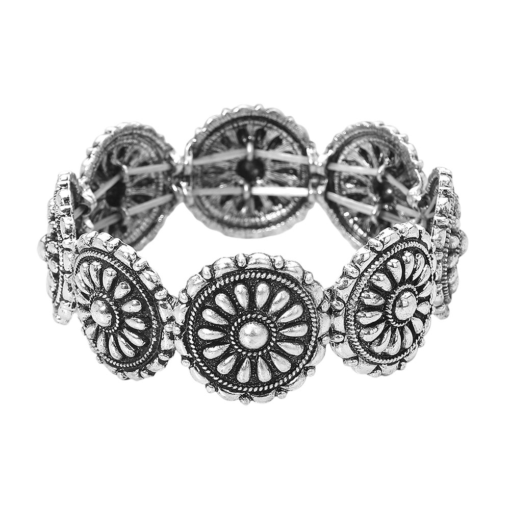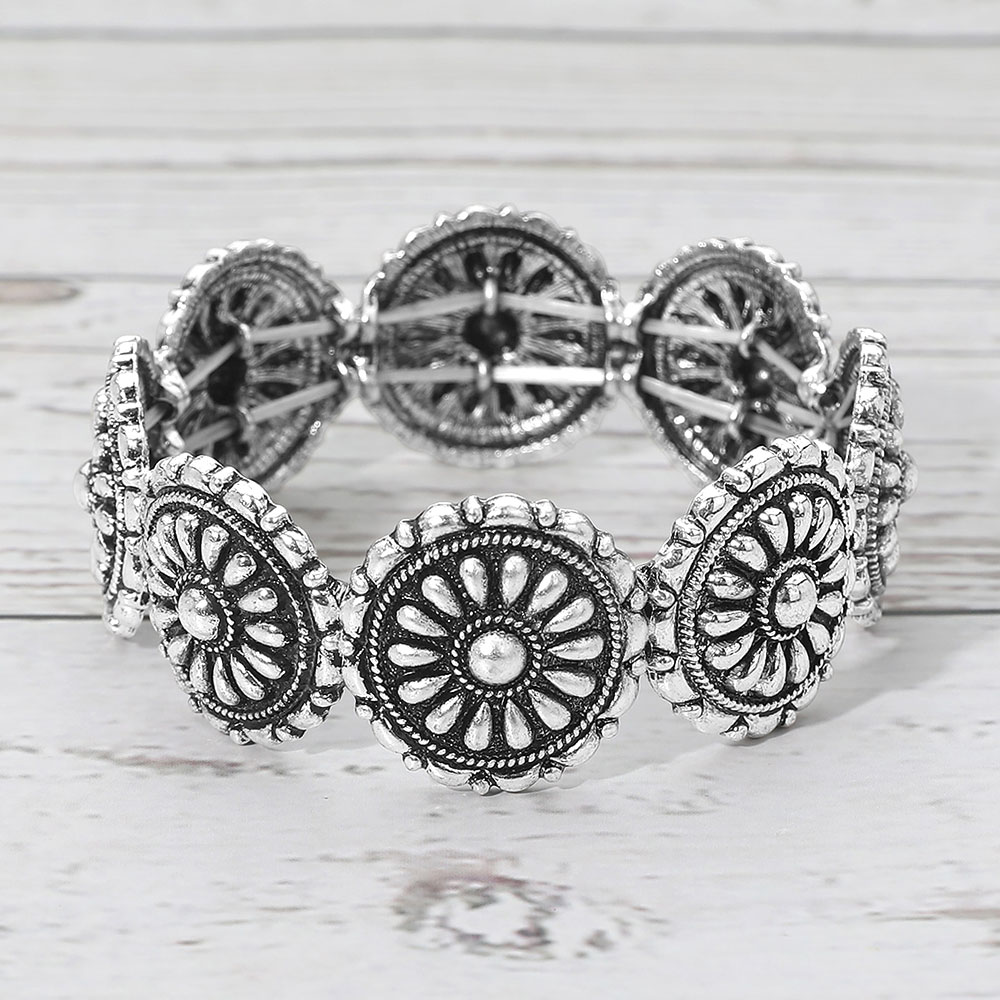Details • Size : 0.9" H • Stretchable • Statement stretch bracelet featuring detailed floral medallion links arranged in a bold, eye-catching design. The flexible construction allows easy slip-on wear with a comfortable fit. Ideal for western-inspired styling, boho looks, or boutique accessory collections that highlight texture, pattern, and standout wrist appeal. • Lead and Nickel Compliant