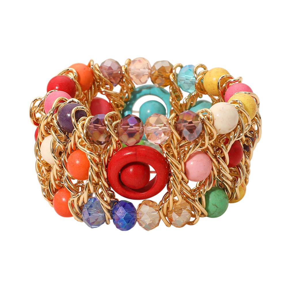 • Bold stretch bracelet designed with layered beads, faceted accents, and interlinked chain details for a dimensional statement look. Comfortable elastic fit allows easy wear while adding texture and shine to everyday or evening styling. Ideal for boutique collections, gifting, event styling, and trend-focused accessory assortments seeking eye-catching yet wearable designs.