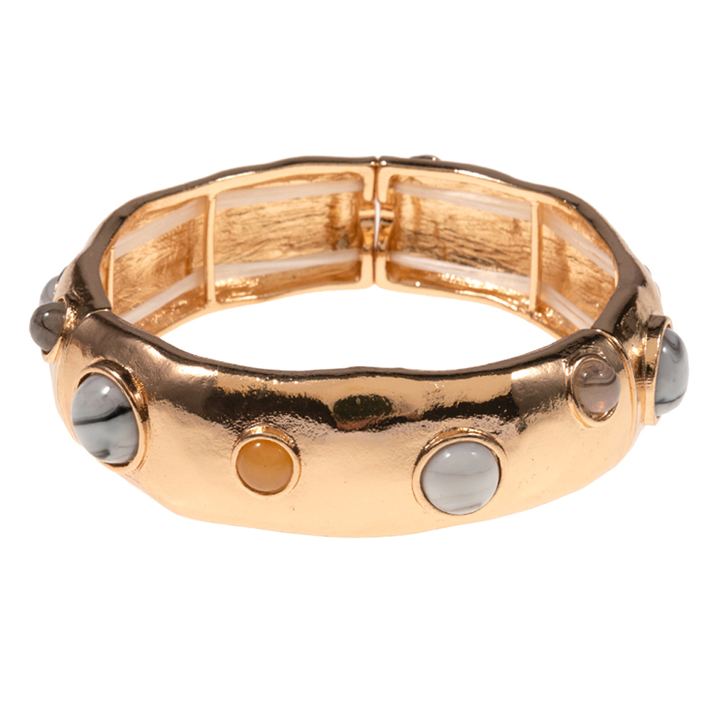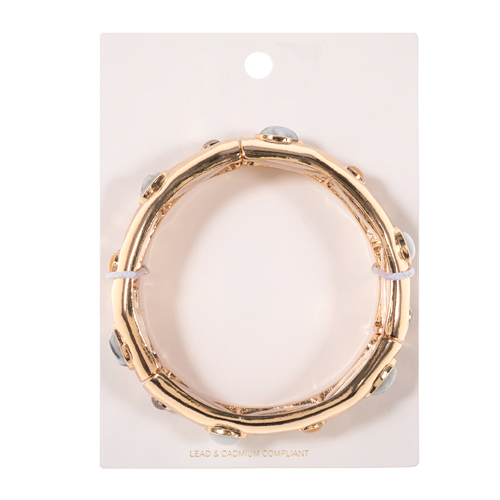 Details • Size : 0.75" h • Stretchable • This textured stretch bangle bracelet features a bold rounded silhouette accented with smooth cabochon-style details for a modern statement look. Designed for easy slip-on wear and comfortable fit, it adds dimension and shine to everyday outfits. Perfect for stacking or wearing solo, this bracelet brings fashion-forward appeal to casual and dress-ready styles alike. • Lead and Nickel Compliant