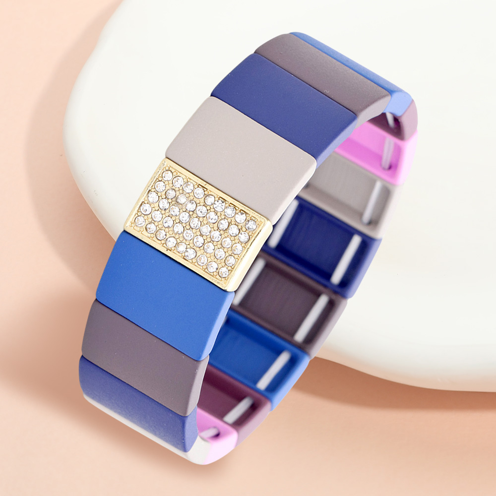 Colorful Wood Rectangle Rhinestone Pave Stretch Bracelet
