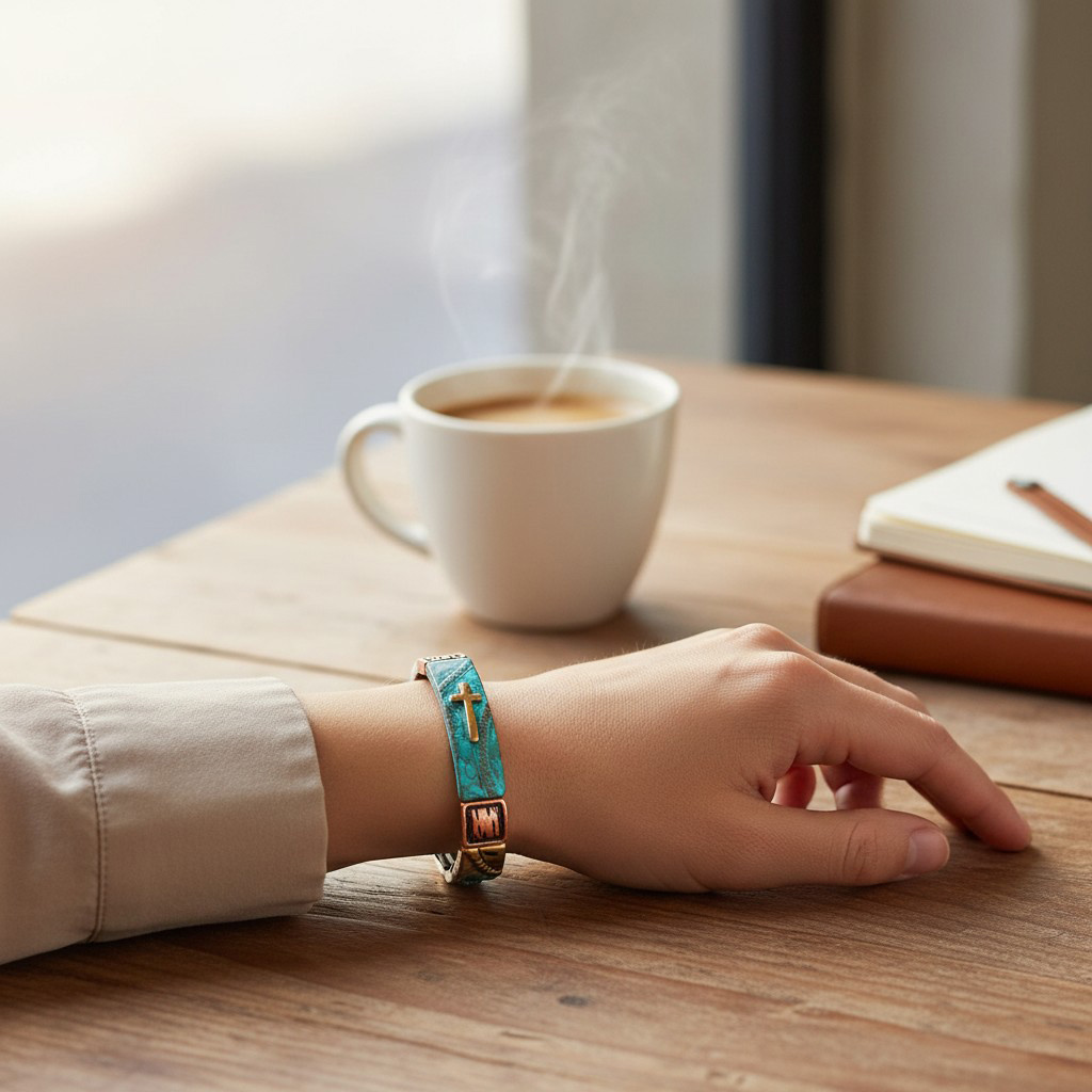 4PCS - Believe Message Cross Charm Semi Precious Wood Ball Faceted Beaded Stretch Bracelets