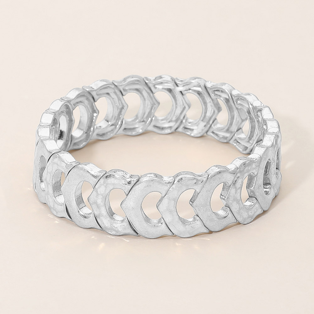 Details • Size : 0.6" H • Stretchable • Bold stretch bracelet featuring repeating links that create a sculptural, modern look. Designed with a flexible slip-on fit for comfort and easy wear. Perfect for stacking or wearing solo, this statement bracelet adds texture, movement, and contemporary edge to everyday outfits or elevated styling. • Lead and Nickel Compliant