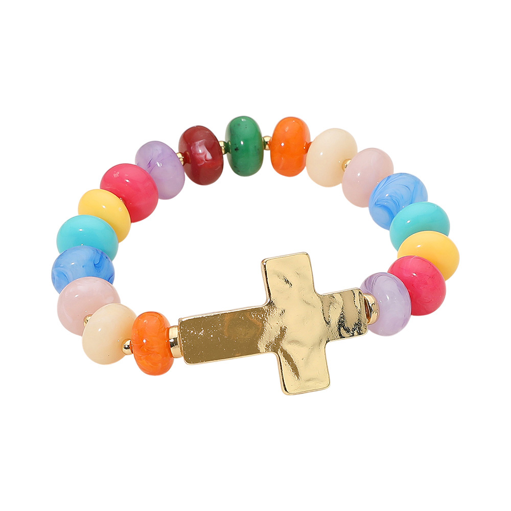 • Colorful beaded stretch bracelet featuring glossy round beads and a bold cross charm centerpiece. Comfortable and stylish, this bracelet makes a meaningful accessory for everyday wear or as a thoughtful gift.