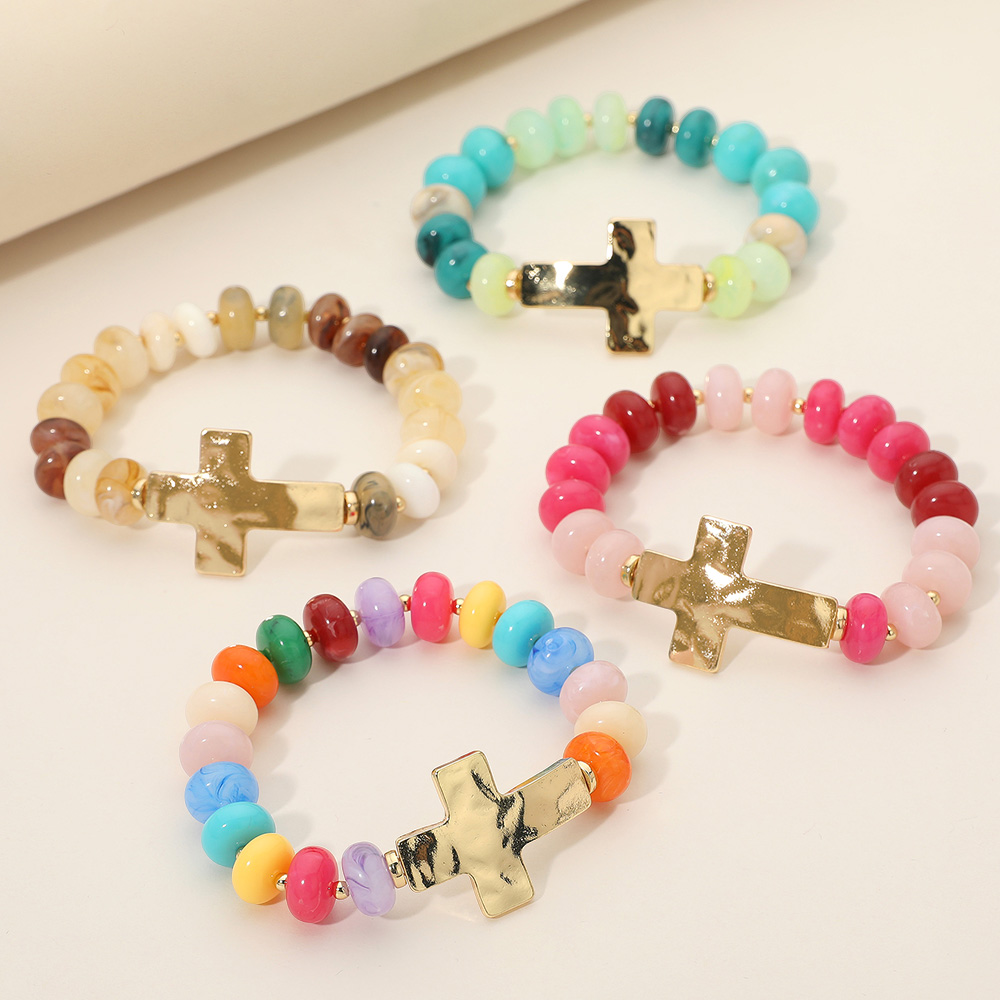 • Colorful beaded stretch bracelet featuring glossy round beads and a bold cross charm centerpiece. Comfortable and stylish, this bracelet makes a meaningful accessory for everyday wear or as a thoughtful gift.