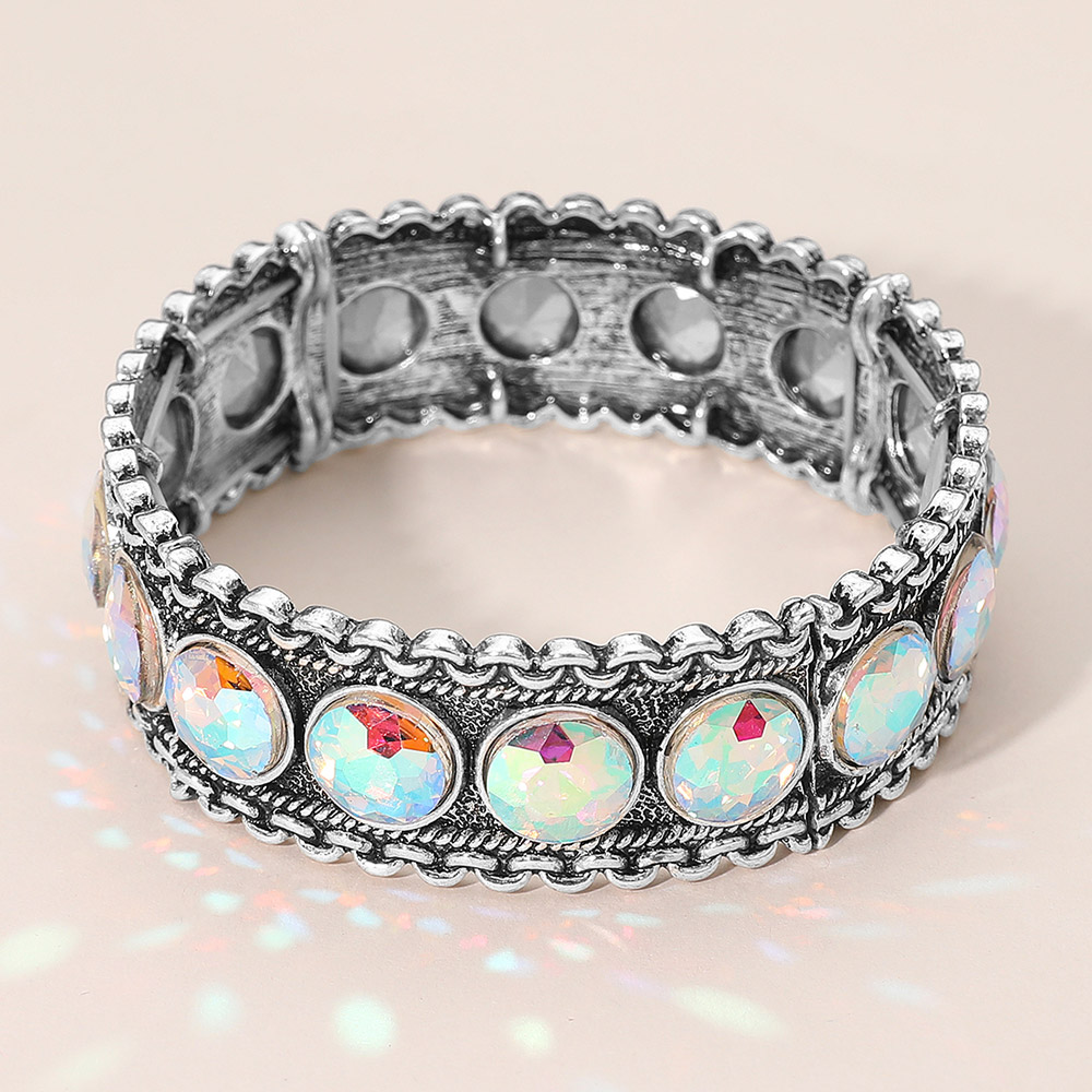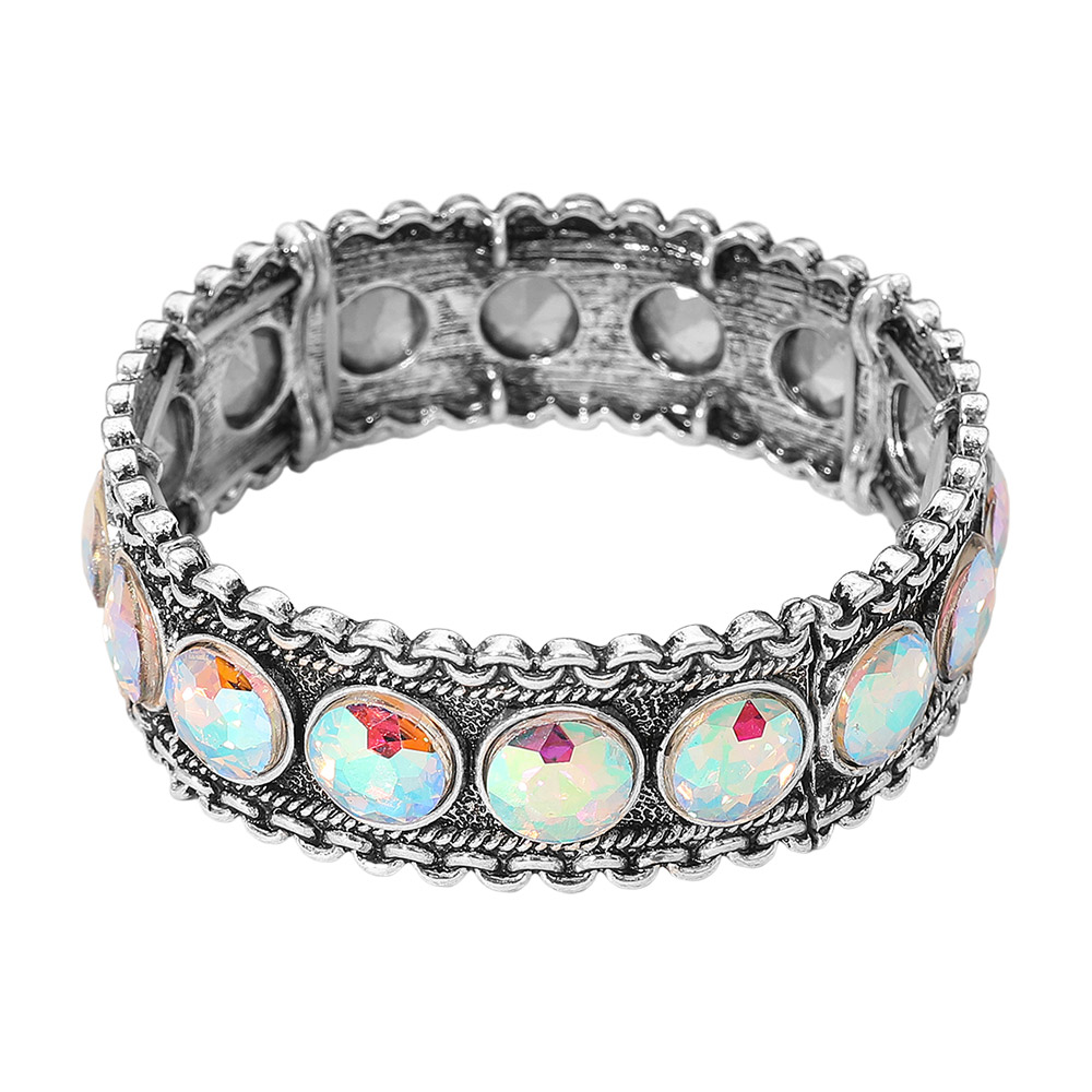 Details • Size : 0.75" H, 2.4" D • Stretchable • Make a bold impression with this vintage-inspired stretch bracelet featuring iridescent crystal accents set in an ornate metal design. Effortlessly blending classic charm with modern shine, it’s the perfect accessory to elevate any outfit from casual chic to evening elegance. • Lead and Nickel Compliant