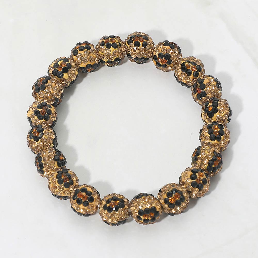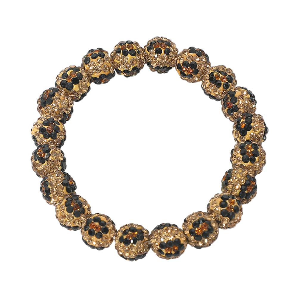 Details • Size : 0.4" H • Stretchable • This leopard shamballa ball bead stretch bracelet delivers bold texture and standout style with evenly spaced round beads designed for easy, comfortable wear. The flexible stretch fit makes it effortless to slip on and off, perfect for stacking or wearing solo. A statement accessory ideal for boutiques, game day collections, trend-forward looks, and giftable fashion jewelry assortments. • Lead and Nickel Compliant