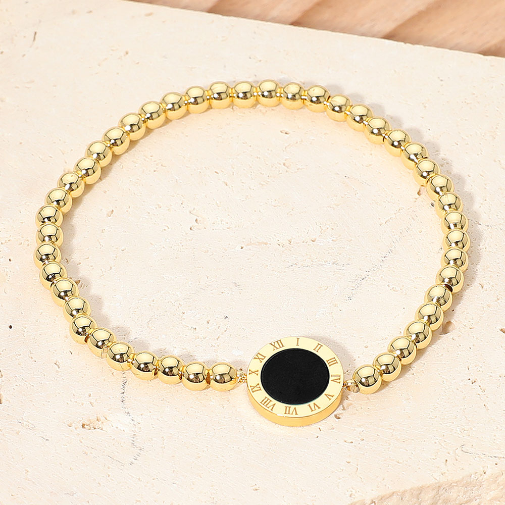 Details • Size : 0.5" H • Stretchable • This elegant gold beaded bracelet features a chic disc charm with Roman numerals, offering a unique twist to your accessories collection. A perfect fusion of timeless sophistication and modern style, this bracelet adds a touch of class to any outfit, making it ideal for both casual and formal occasions. • Stainless Steel