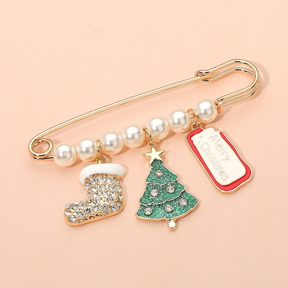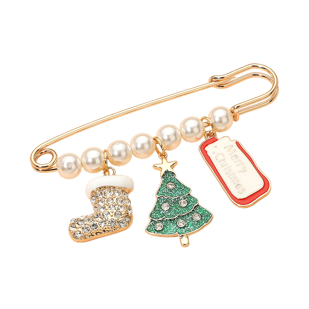 • Spread holiday cheer with this festive brooch featuring sparkling stocking, Christmas tree, and Merry Christmas charm details. Accented with elegant beads, this joyful accessory is perfect for pinning on coats, scarves, or bags to add a merry touch to any seasonal look.