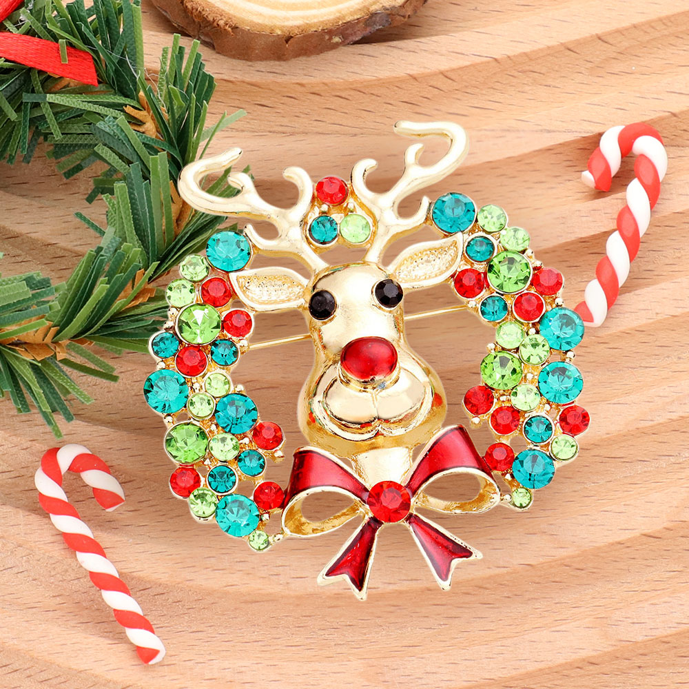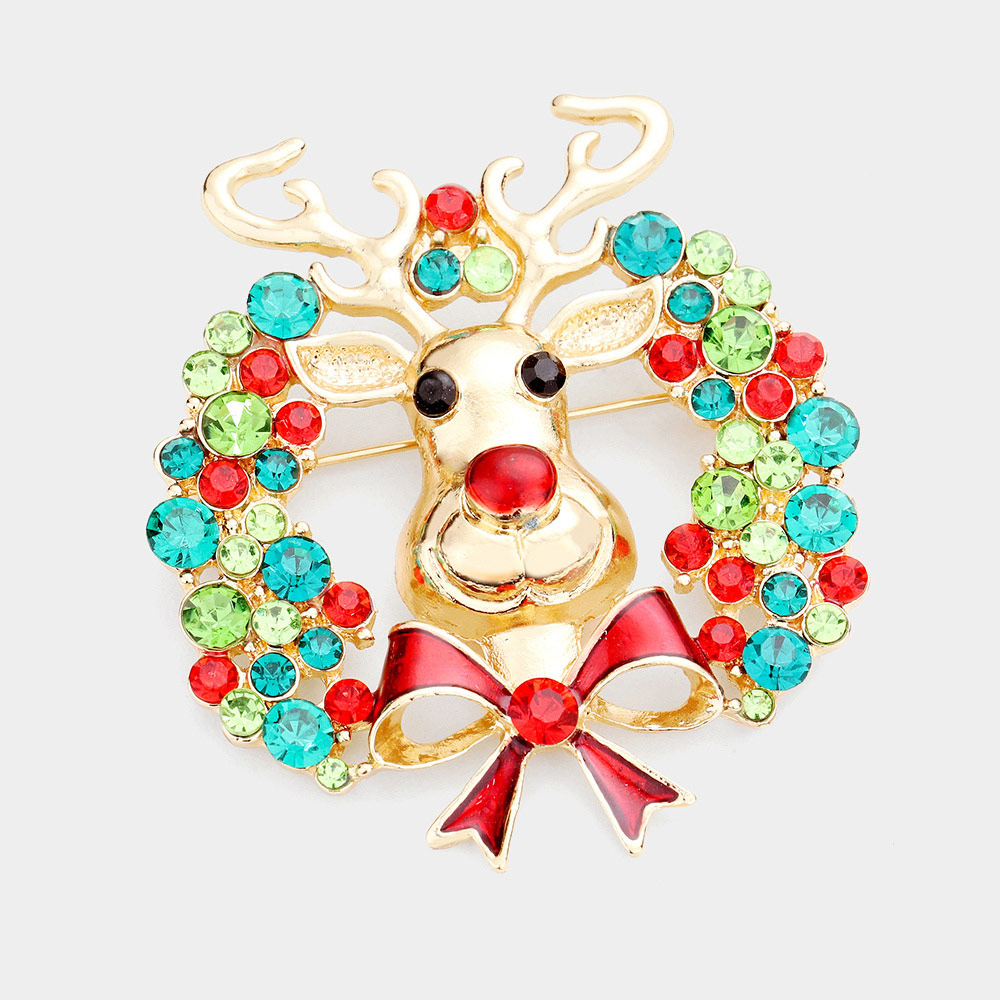 Details • Size : 2" X 2.25" • Pin Brooch • Celebrate the season with this charming reindeer wreath brooch featuring sparkling details and a decorative bow. Perfect for holiday outfits, this playful accessory adds a cheerful touch to your look with a blend of festive elegance and whimsy. • Lead and Nickel Compliant