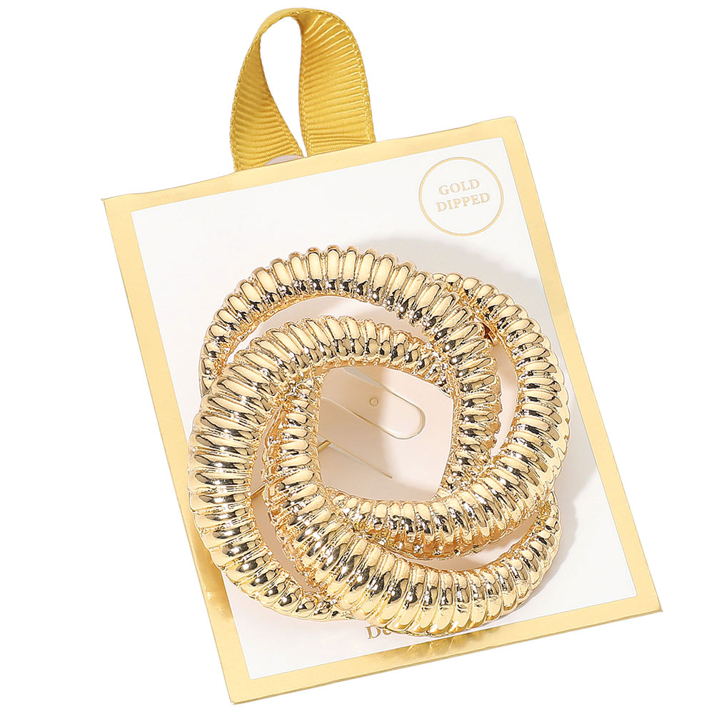 Details • Size : 2.2" X 2.2" • Pin Brooch • Statement brooch featuring interlocking textured loops that create a bold sculptural look. Perfect for jackets, scarves, dresses or bags, adding modern elegance and eye-catching detail. A standout accessory for special occasions or elevating everyday style. • Gold Dipped • Lead and Nickel Compliant