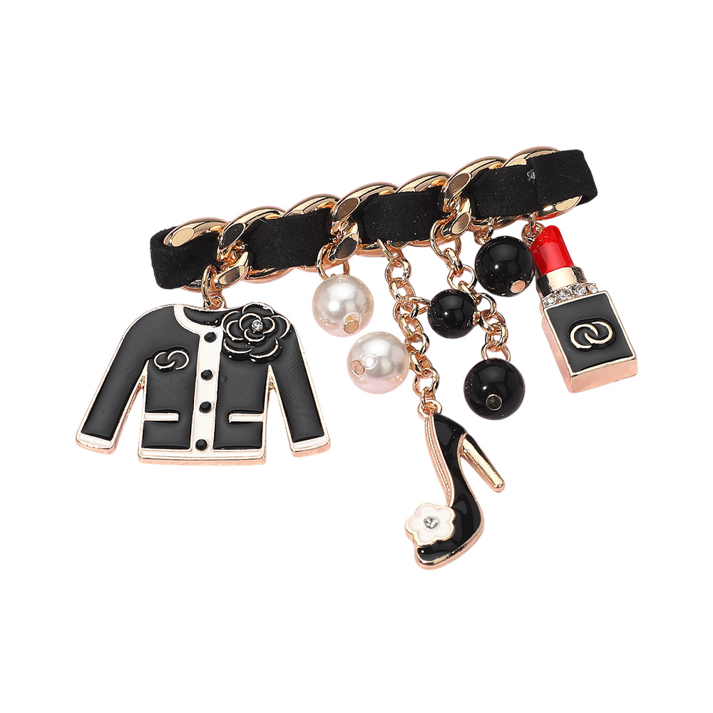 Details • Size : 2.75" X 2.75" • Pin Brooch • Chic fashion charm brooch featuring a mix of playful miniature pendants including a jacket, lipstick, and heel, accented with beaded details. A trendy statement accessory that adds personality and couture-inspired flair to jackets, bags, or scarves. • Lead and Nickel Compliant