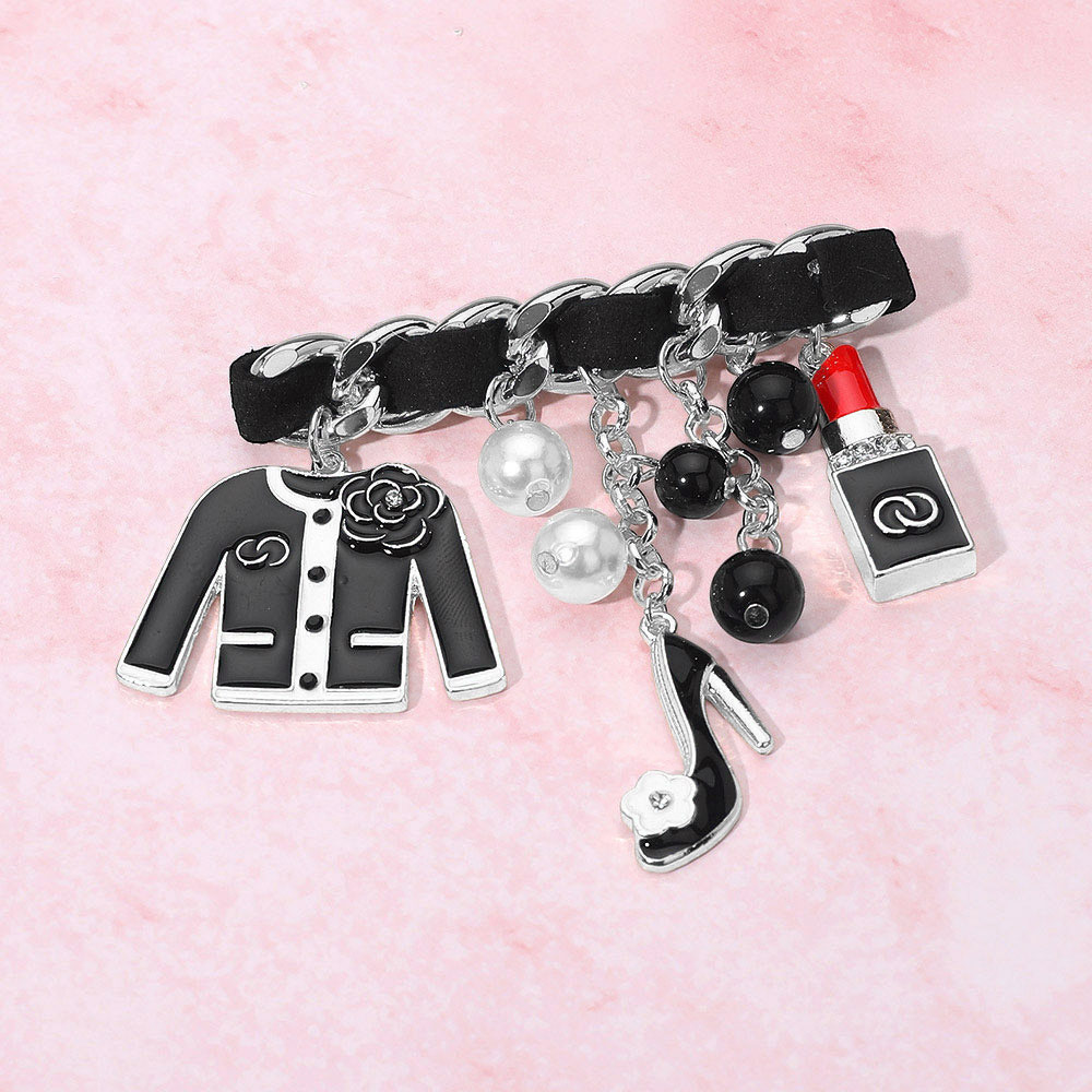 Details • Size : 2.75" X 2.75" • Pin Brooch • Chic fashion charm brooch featuring a mix of playful miniature pendants including a jacket, lipstick, and heel, accented with beaded details. A trendy statement accessory that adds personality and couture-inspired flair to jackets, bags, or scarves. • Lead and Nickel Compliant