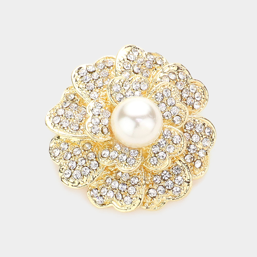 Pearl Centered Crystal Pave Flower Pin Brooch