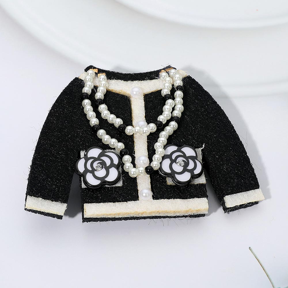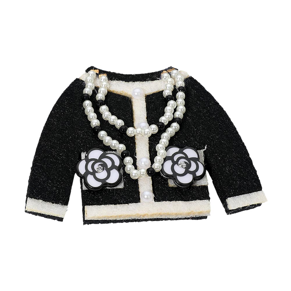 • Stylish dual-function brooch and hair clip shaped like a jacket, adorned with layered pearl chains and floral accents. Perfect for enhancing jackets, bags, or hairstyles, offering a touch of timeless fashion elegance with a versatile and sophisticated design.