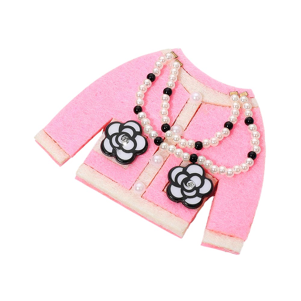 • Stylish dual-function brooch and hair clip shaped like a jacket, adorned with layered pearl chains and floral accents. Perfect for enhancing jackets, bags, or hairstyles, offering a touch of timeless fashion elegance with a versatile and sophisticated design.