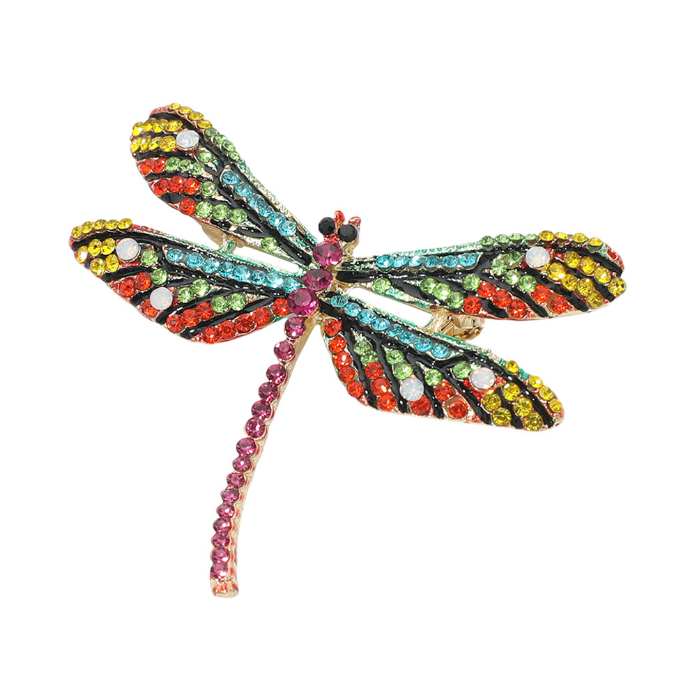 Details • Size : 2.5" X 2.25" • Pin Brooch • Statement dragonfly brooch pin designed with intricate wing detailing and sparkling accents that create eye catching dimension. A bold nature inspired accessory ideal for styling jackets, dresses, scarves, or bags, perfect for boutiques seeking unique conversation pieces with artistic charm. • Lead and Nickel Compliant