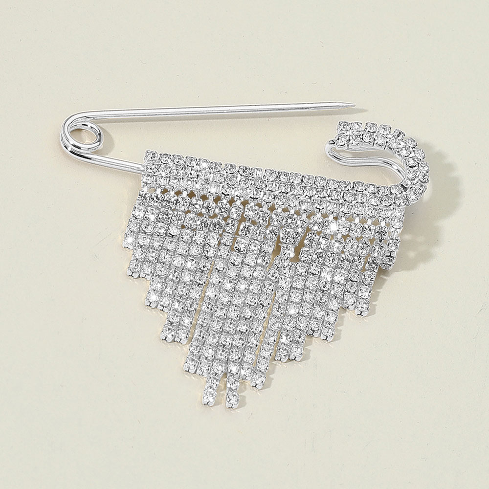 Details • Size : 2.9" X 2.9" • Pin Brooch • Elegant rhinestone safety pin brooch featuring cascading layered fringe design. A chic statement accessory to add sparkle to jackets, scarves, bags, or dresses, perfect for both casual and formal styling. • Lead and Nickel Compliant