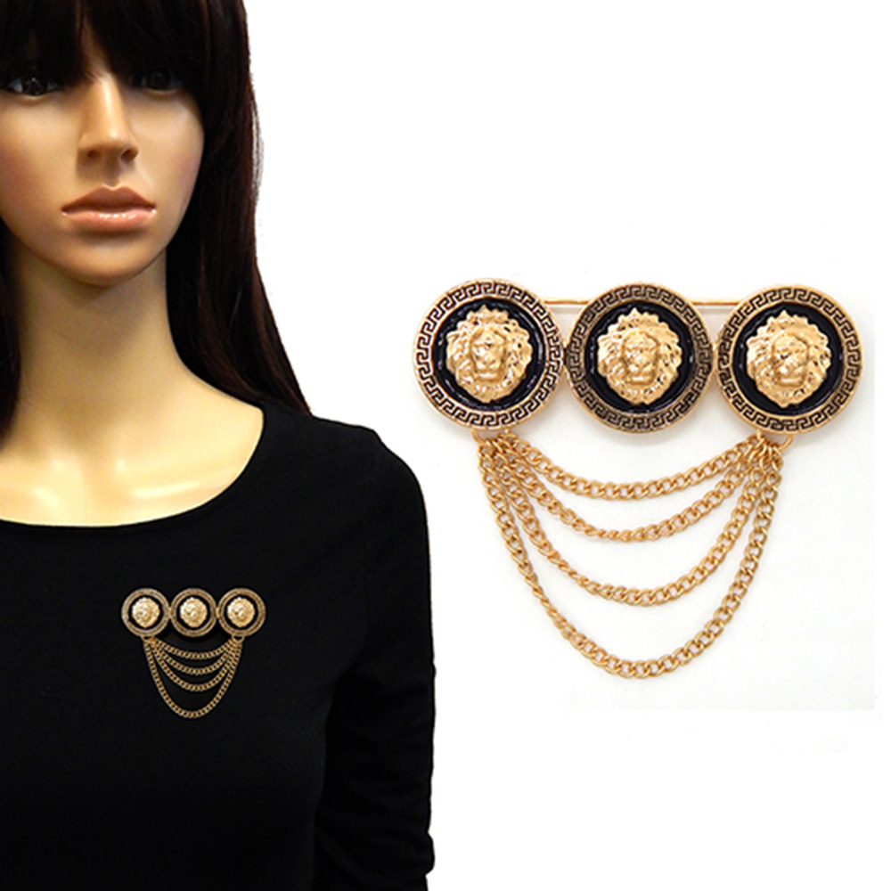 Triple Lion Head Pointed Chain Pin Brooch