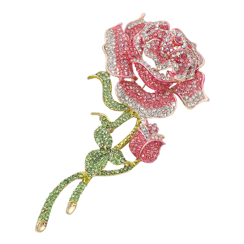 • Chic rhinestone rose brooch featuring a detailed floral silhouette with shimmering stones on the petals, stem, and leaves. Perfect for accessorizing jackets, dresses, scarves, or bags with a refined and eye-catching statement touch.
