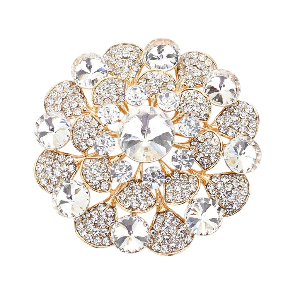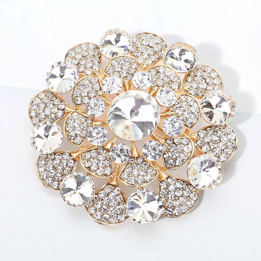 • This stunning round crystal flower brooch features layered gem accents that create a dazzling floral design. Perfect for elevating any outfit, it adds a touch of vintage-inspired glamour and refined brilliance to jackets, scarves, or formal attire.