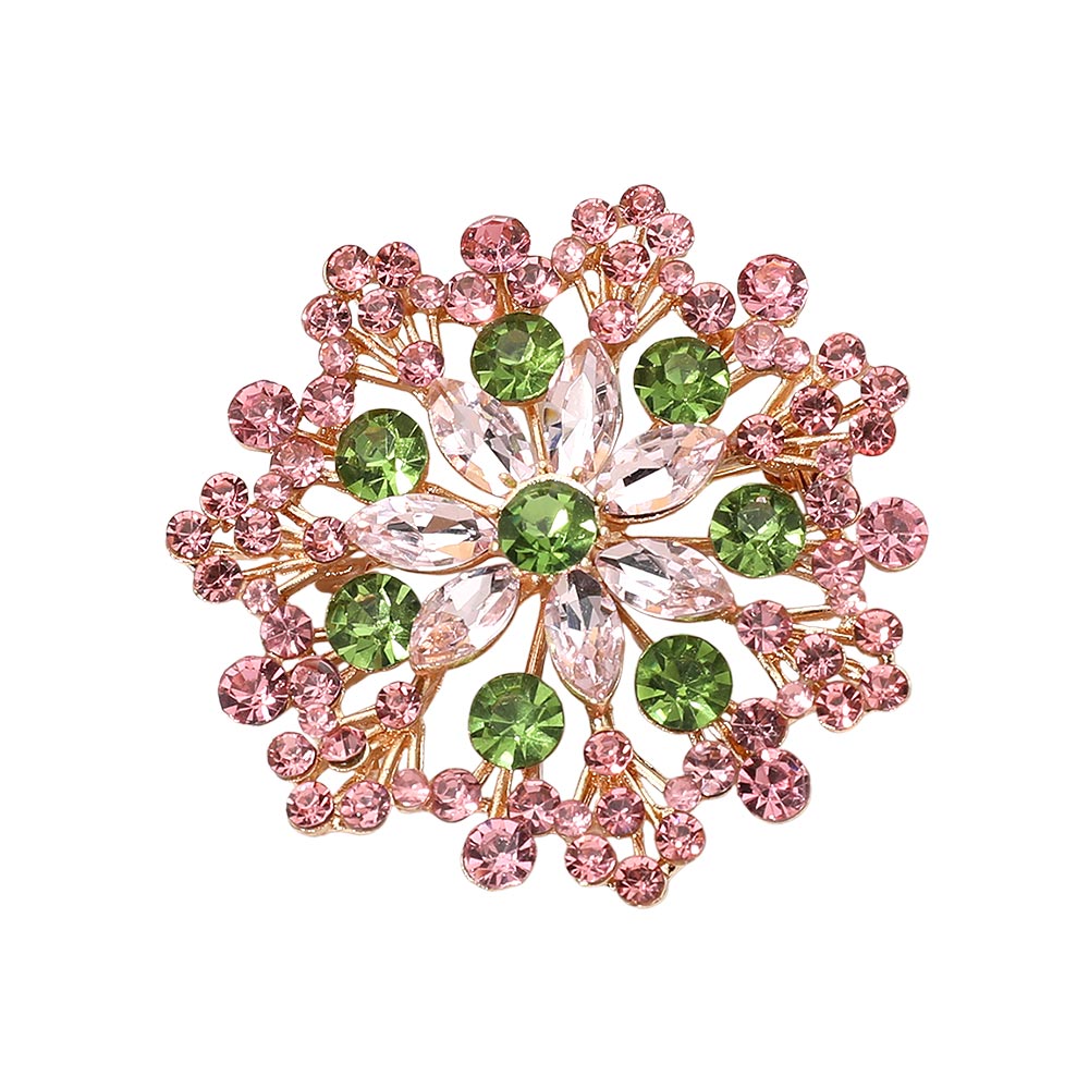 Details • Size : 2" X 2" • Pin Brooch • Eye-catching floral statement brooch designed with layered crystal accents arranged in a radiant cluster silhouette. This decorative pin adds elegant sparkle and dimension to jackets, scarves, dresses, and accessories, making it ideal for formal styling, seasonal collections, and fashion-forward displays. • Lead and Nickel Compliant