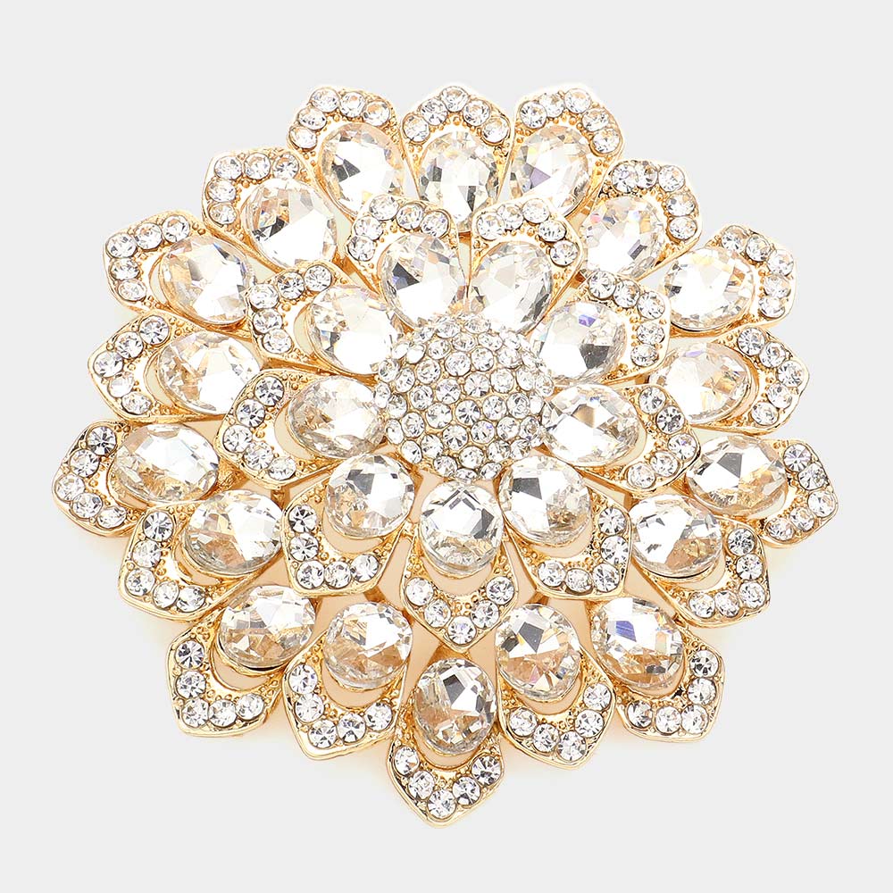 Details • Size : 3.1" X 3.1" • Pin Brooch • Stunning floral brooch designed with layered petals and iridescent crystal gemstones. Perfect as a statement accessory for dresses, scarves, shawls, or special occasions, adding sparkle and elegance to any outfit. • Lead and Nickel Compliant