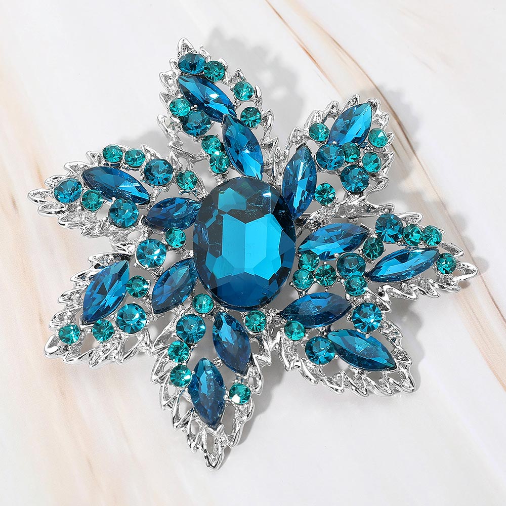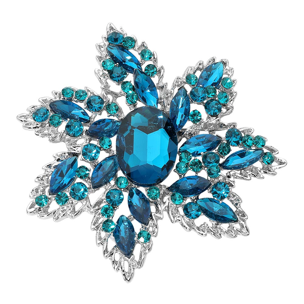 • This ornate floral brooch features an intricately layered design with a bold faceted centerpiece surrounded by shimmering accents. Its radiant, sculpted silhouette adds a refined touch to formalwear, evening outfits, or special-occasion ensembles, creating a timeless statement full of sophistication.