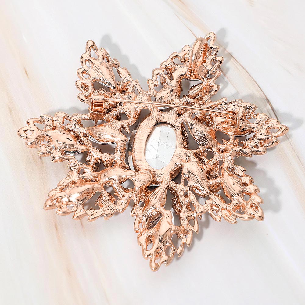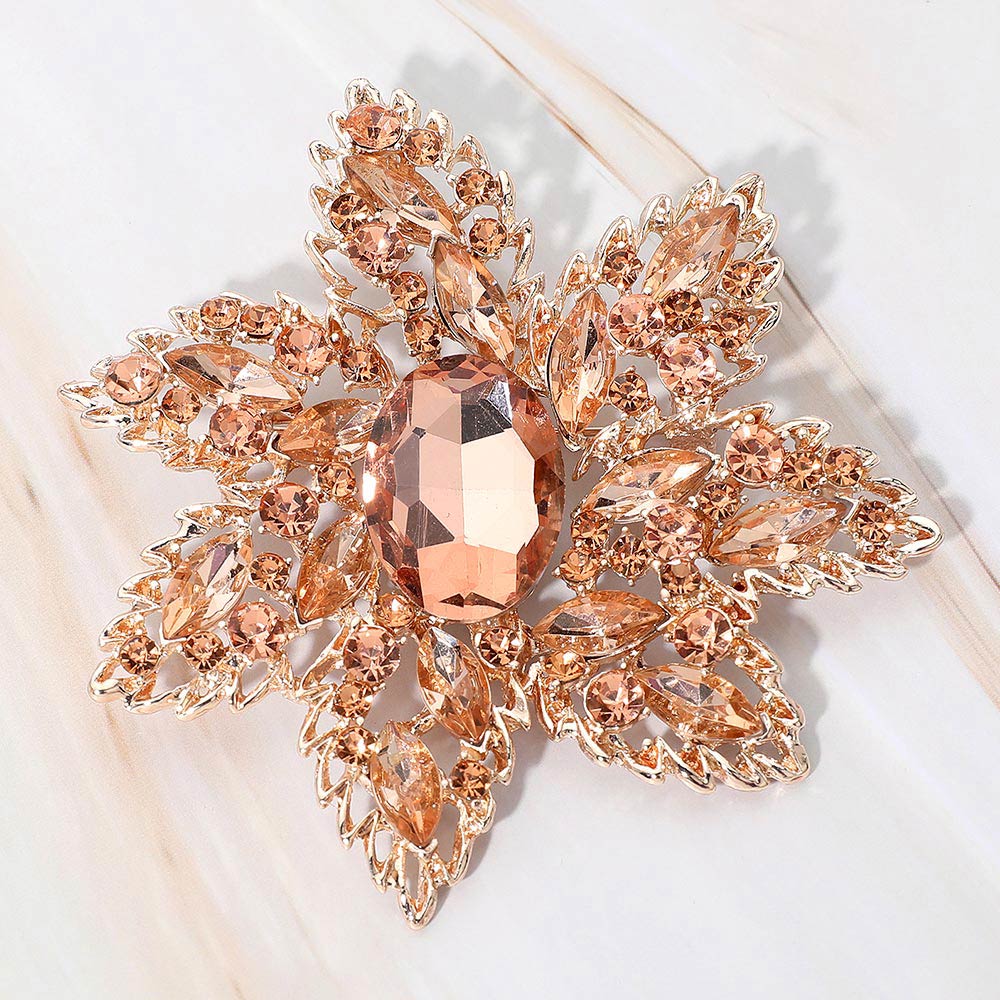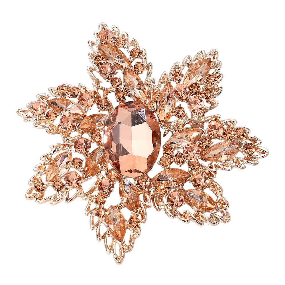 • This ornate floral brooch features an intricately layered design with a bold faceted centerpiece surrounded by shimmering accents. Its radiant, sculpted silhouette adds a refined touch to formalwear, evening outfits, or special-occasion ensembles, creating a timeless statement full of sophistication.